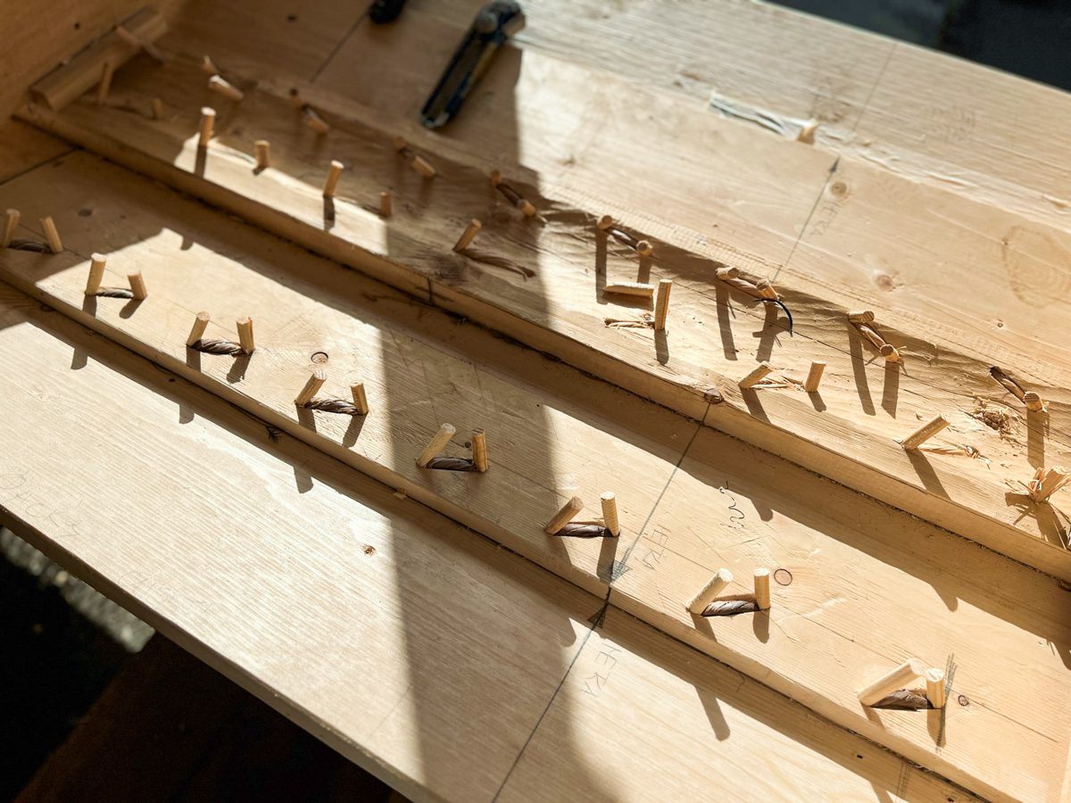 Матвей делает из квадратных штапиков круглые рейки для нагелей.