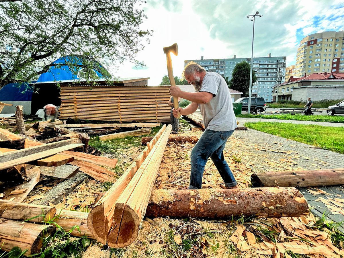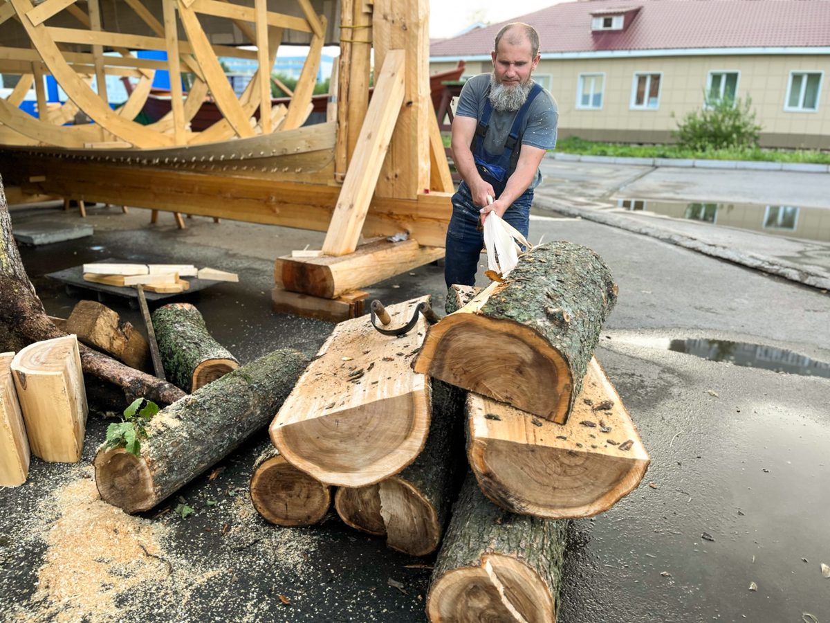 Саша Антонов вытесывает румпель и запрещает себя снимать. Похоже, нам придется искать дублера. Какого-нибудь Брэда Питта, например. Только сколько ж его придется учить держать топор…