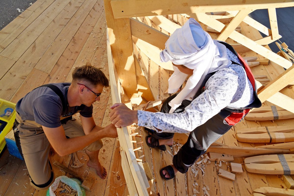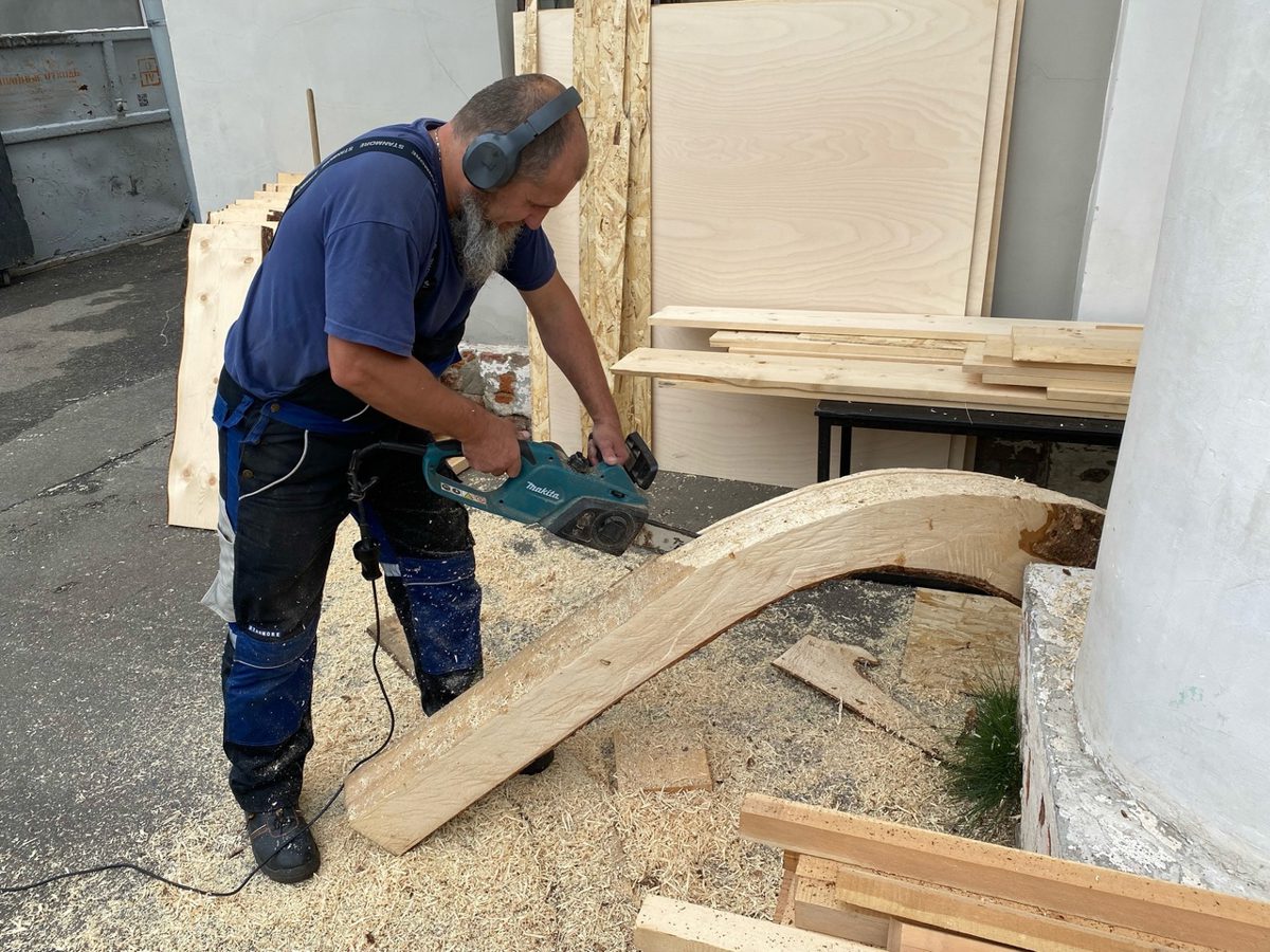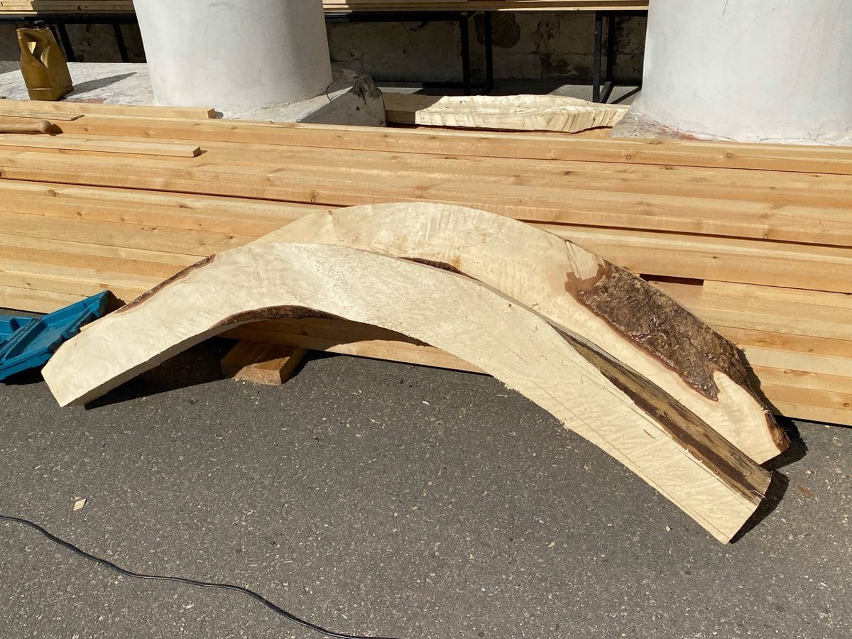 Артем примеряется к кокорам, чтобы делать из них опруги — шпангоуты.