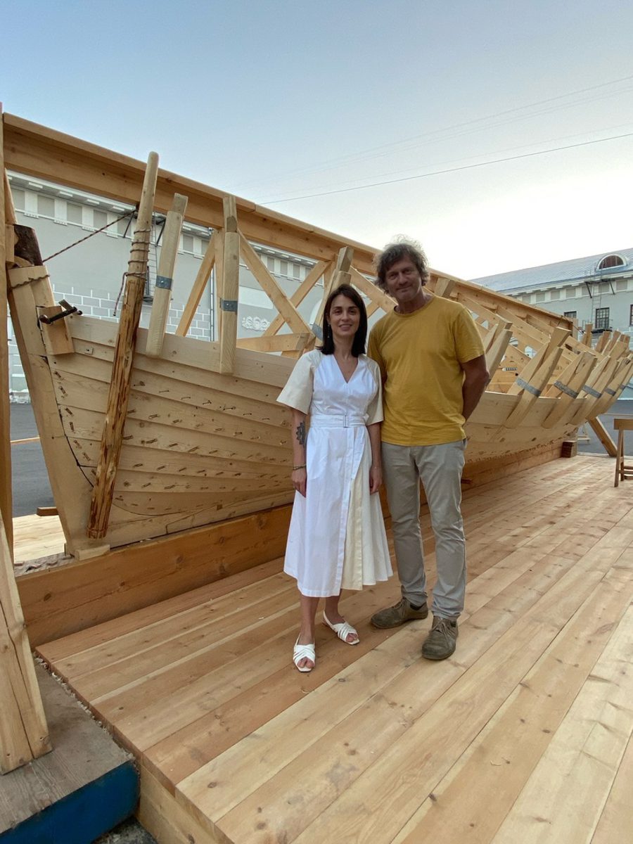 Приходила на стройку телеведущая Ирина Муромцева. Совсем недавно она была в гостях на верфи в Архангельске, а теперь пришла к нам в Москве.