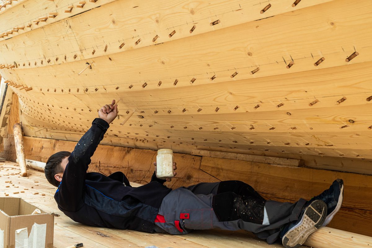 Понедельник должен был быть выходным. Хотя бы наполовину. Не получилось. Закончили устанавливать шпангоуты. Иван установил на нагеля степс фок-мачты. Максим строгает рангоут. Нашли пылесос, убрались внутри карбаса и покрыли его защитной пропиткой.
