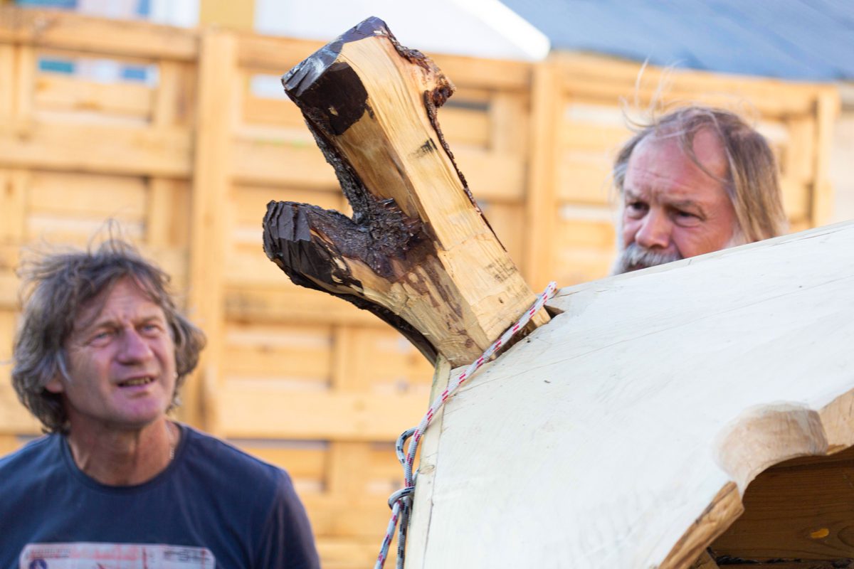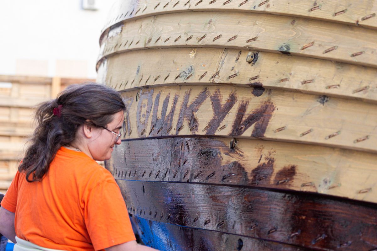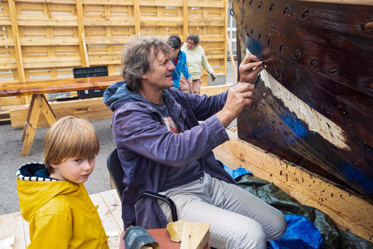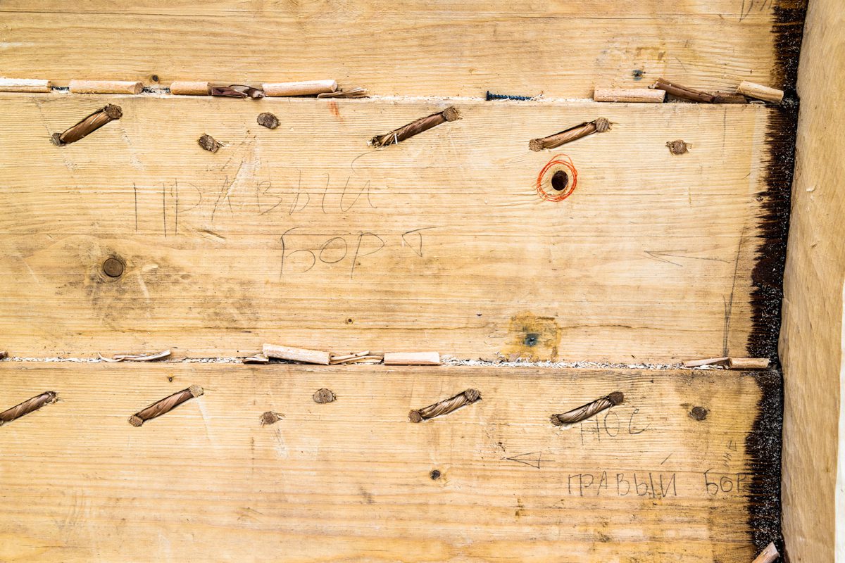 Выбрали название, режем его на борту, малюем смолой, ищем аутентичности. Саша заканчивает руль. Ваня работает с привальниками. Беспросветное количество дел.