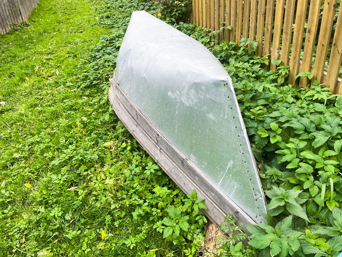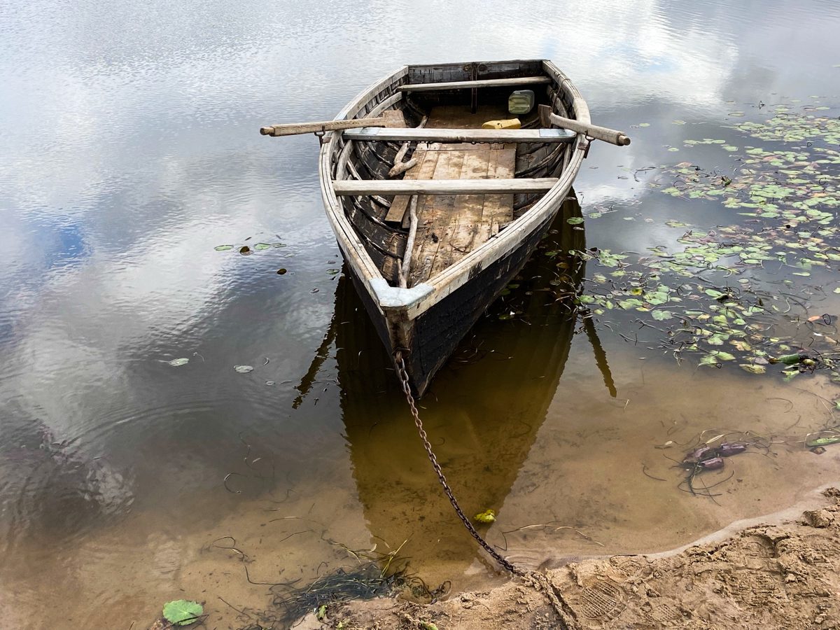 1240, зашли в полой и встали смотреть шитуху Николая Суханова. Хорошая деревянная лодочка с широкой кормой и плоским дном. Видно, что легка на ходу. Построена в 1986 году в Устюге. Жаль, что таких уже не строят.