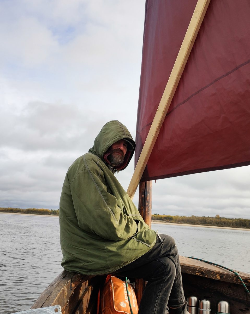 1109, стартуем от стоянки не доходя Пучуги. Сидим на мели, ставим паруса, снова садимся на мель. Лавируем против слабого встречного ветерка. Хмуро вокруг.