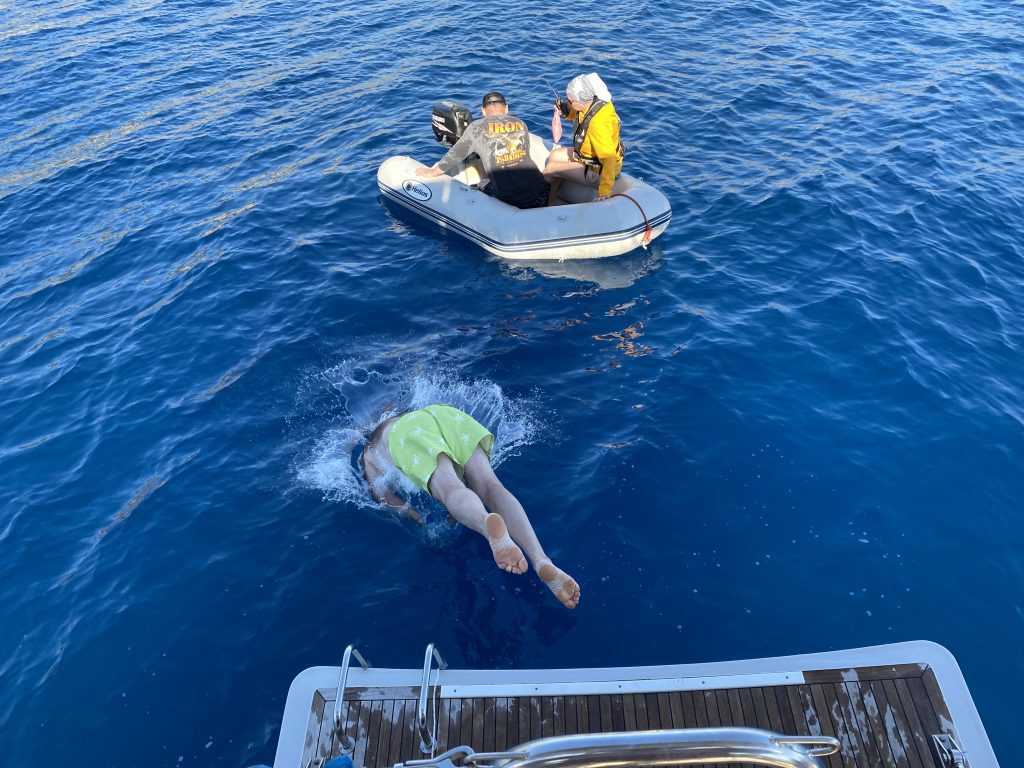 Дима и Таня вздумали поехать на прогулку в Калкан. Дали им тузик с дохлым мотором, весла и рацию, благословили. А ехать мили полторы. Через 20 минут выяснилось, что мотор захлестнуло волной, или он сам заглох. Хорошо, что ветер дует на берег. Закончилось все благополучным спасением.