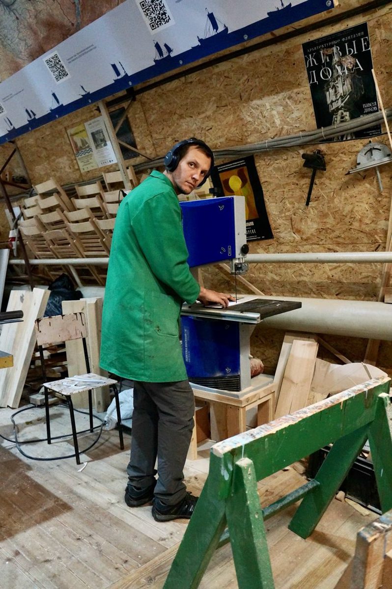 Лёша (вятский) с лицом каменного идола заталкивает доски в жерло рейсмусового станка. Мы заметили, что лицо и живот у Лёши при работе всегда неподвижны. Лёша делает из досок опилки. Опилки он складывает в мешки, мешки мы продаём по 100 руб. за штуку. Спешите купить верфяных опилок! Опилки очень мягкие и сухие, средней фракции. Такие опилки в два раза ярче горят и в четыре раза больше впитывают. «Десять досок — опилок мешок!» — сообщает нам Алексей, перекрикивая шум рейсмусового станка.