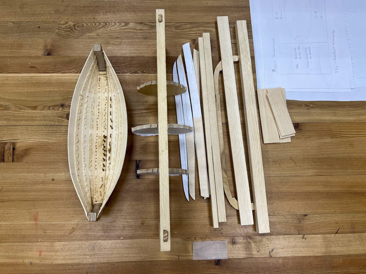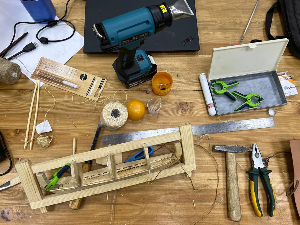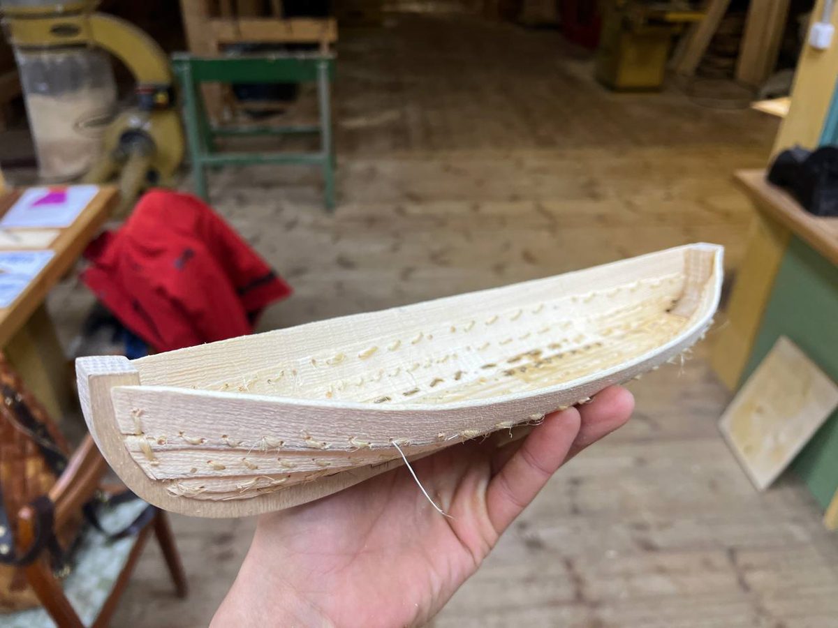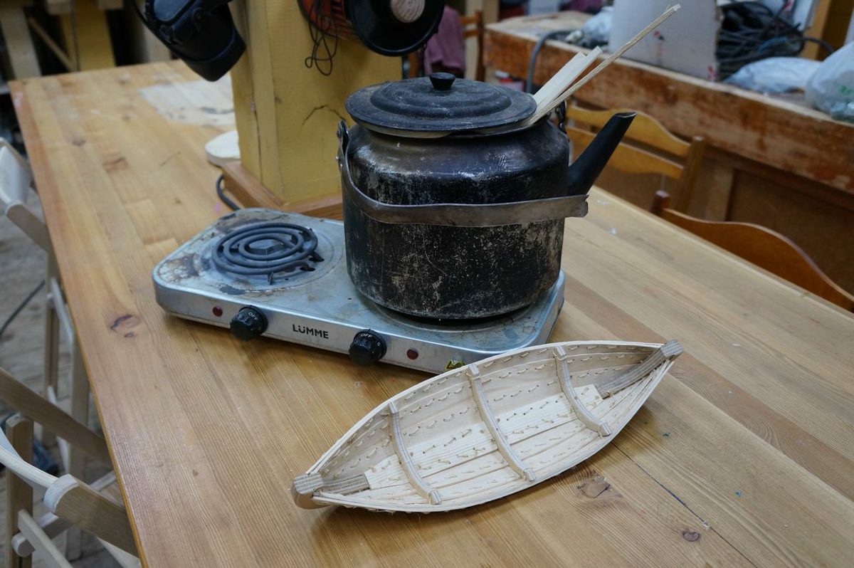 У Миши включен таймер. Нужно уложиться в запланированные восемь часов занятий. Миша вычерчивает 3D-модель в компьютере, распечатывает шаблоны на принтере, выпиливает детали на ленточнопильном станке и собирает модель в игрушечном стапеле на верстаке. Кипятит лучину в чайнике и сшивает набои суровой ниткой, полностью имитируя, таким образом, процесс изготовления настоящего карбаса.