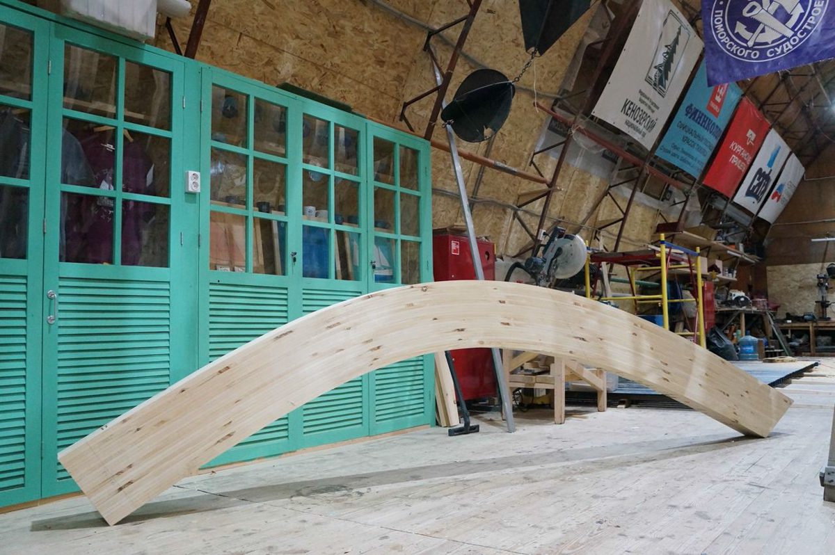 То, что в конечном итоге остаётся от опилок, называется — ламель. Ламели нужны для изготовления клеёных шпангоутов. Время от времени Артём Саша и Лёша сходятся в «железном углу», чтобы загнуть шпангоут. Сначала они мажут ламели клеем, затем укладывают их на вайму, зажимают струбцинами и выгибают шпангоут талёвками по упорам.