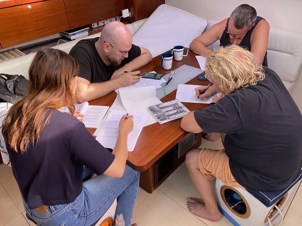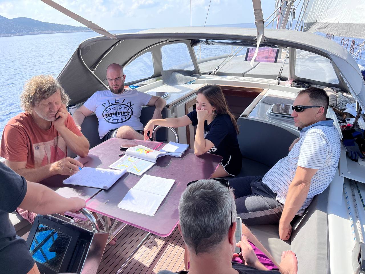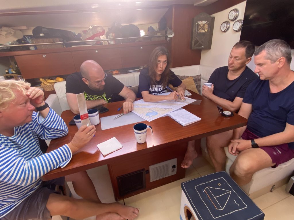 Очень много нужно успеть за время нашего плавания: и под парусами походить, и потренироваться на ходу. Снова занимаемся МППСС, Теорией паруса. На ходу — узлами, поворотами, ставим и убираем паруса.