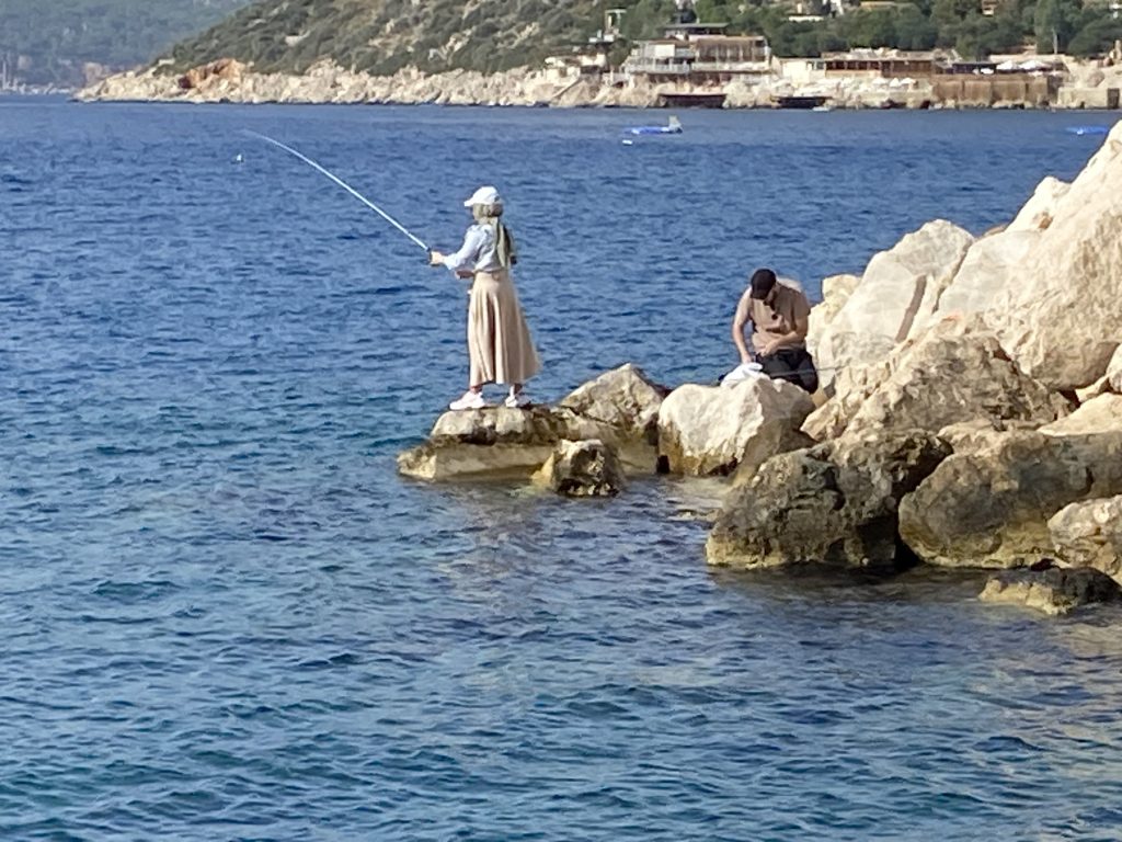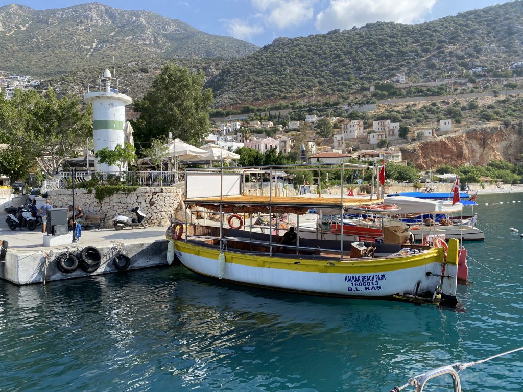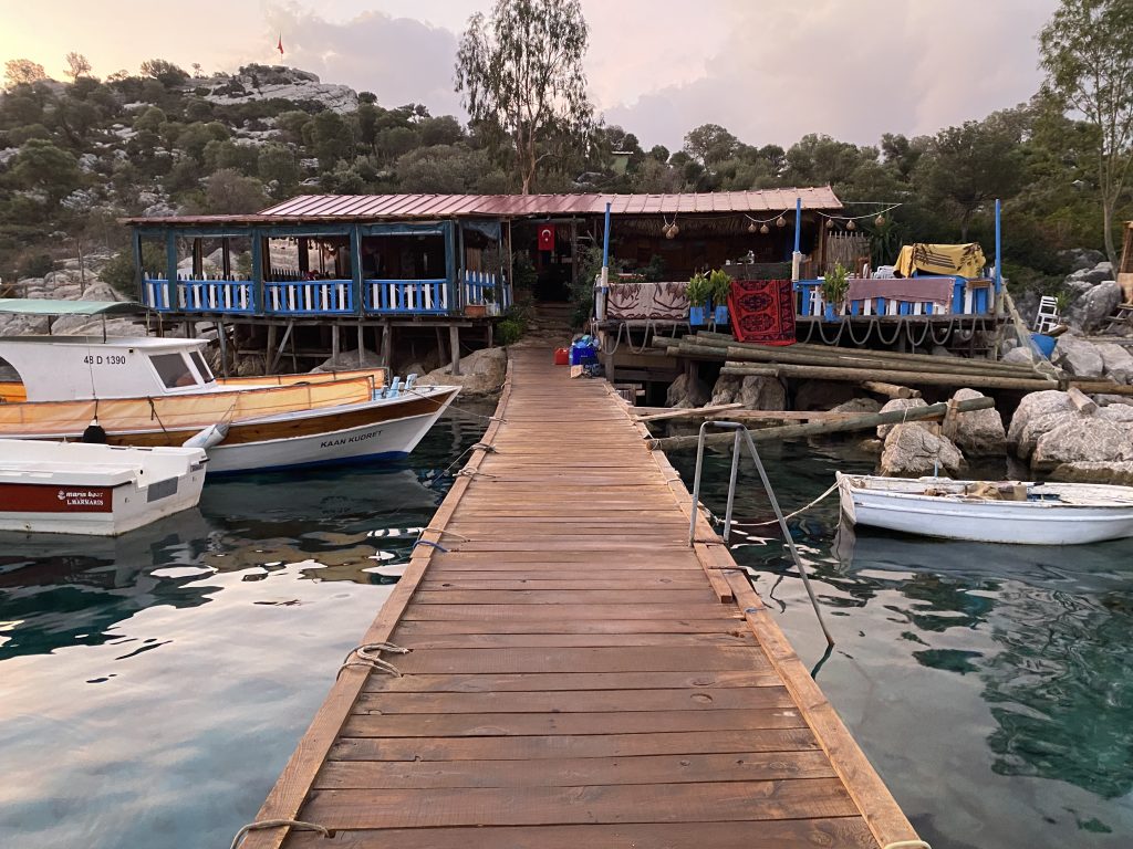 1630, встали в бухте Калкана среди гулет и рыбацких суденышек. Выбрали самый нарядный ресторан.