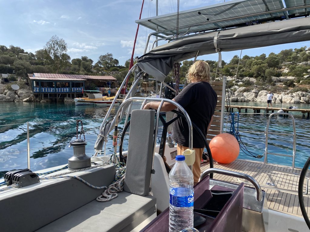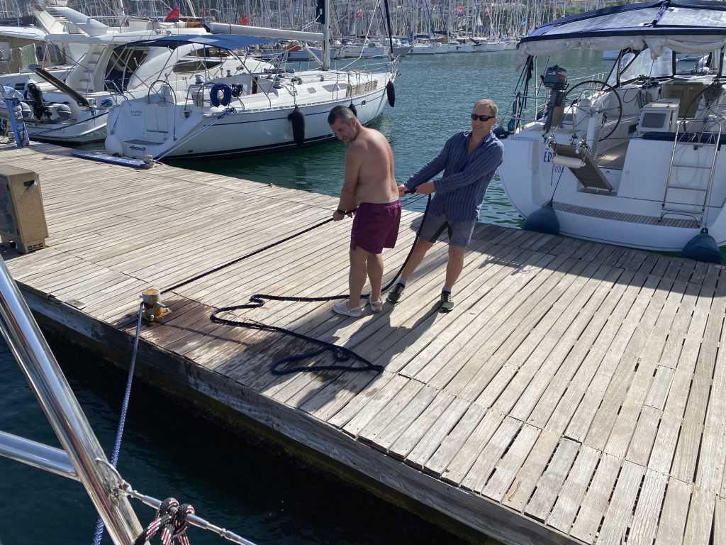 1135, начали швартоваться кормой к внешнему понтону марины Фитхие. Подходим кормой при наличии бокового ветра. Задаем и вывешиваемся на наветренном швартове. Здесь это удобно делать.