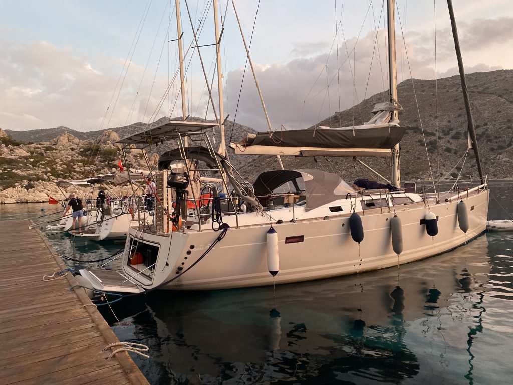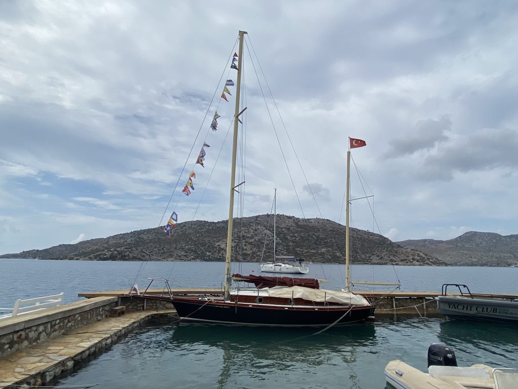 1830, мест нет в марине Фетхие. Кусочком кормы притулились к понтону Яхтклассик-марины.