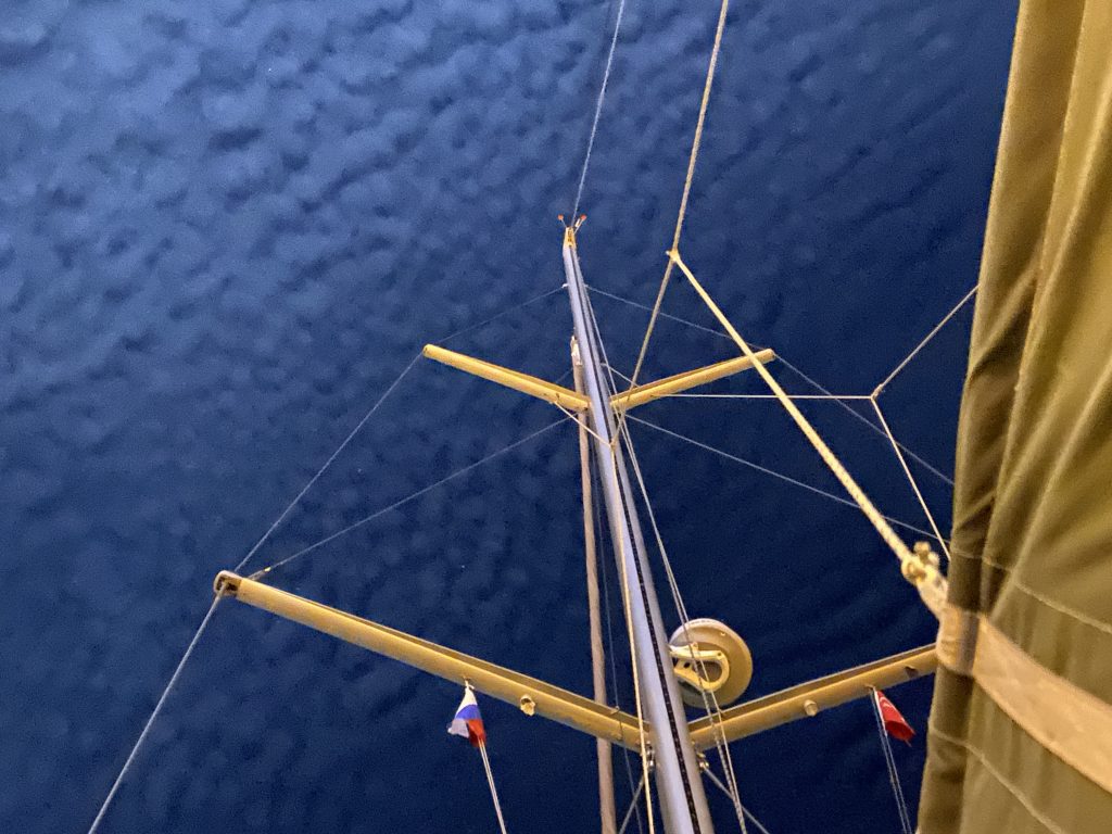 1800, позанимались «Джульеттой». Подрезали веревку закрутки стакселя (конец обтрепался), поменяли ролик закрутки на релинге.