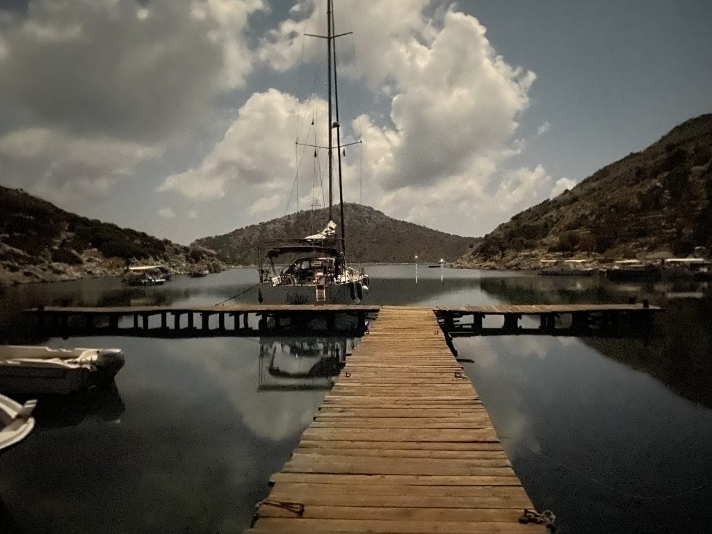 1616, замечательно лавируемся по шелковой воде вокруг мысов напротив греческого Сими. Видели странные волны из неоткуда (позже узнали, что в этот день было землетрясение).