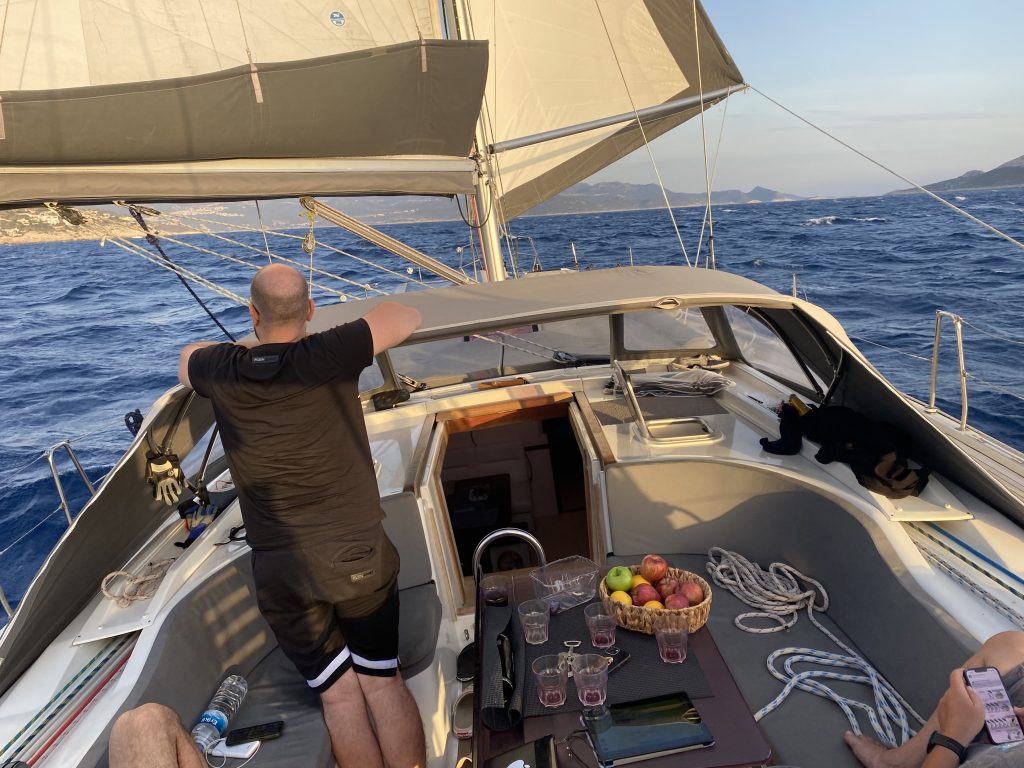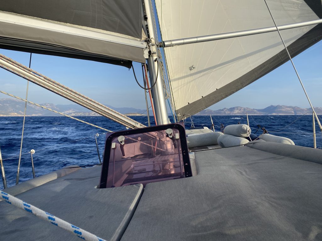 1200, умеренный ветерок заходит с кормы с разных углов, пока мы огибаем острова вдоль греческой границы. Крутим повороты через фордевинд.