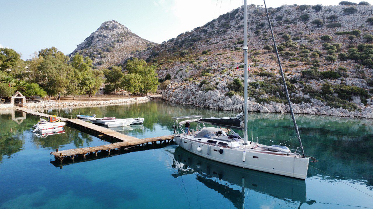 1830, мест нет в марине Фетхие. Кусочком кормы притулились к понтону Яхтклассик-марины.