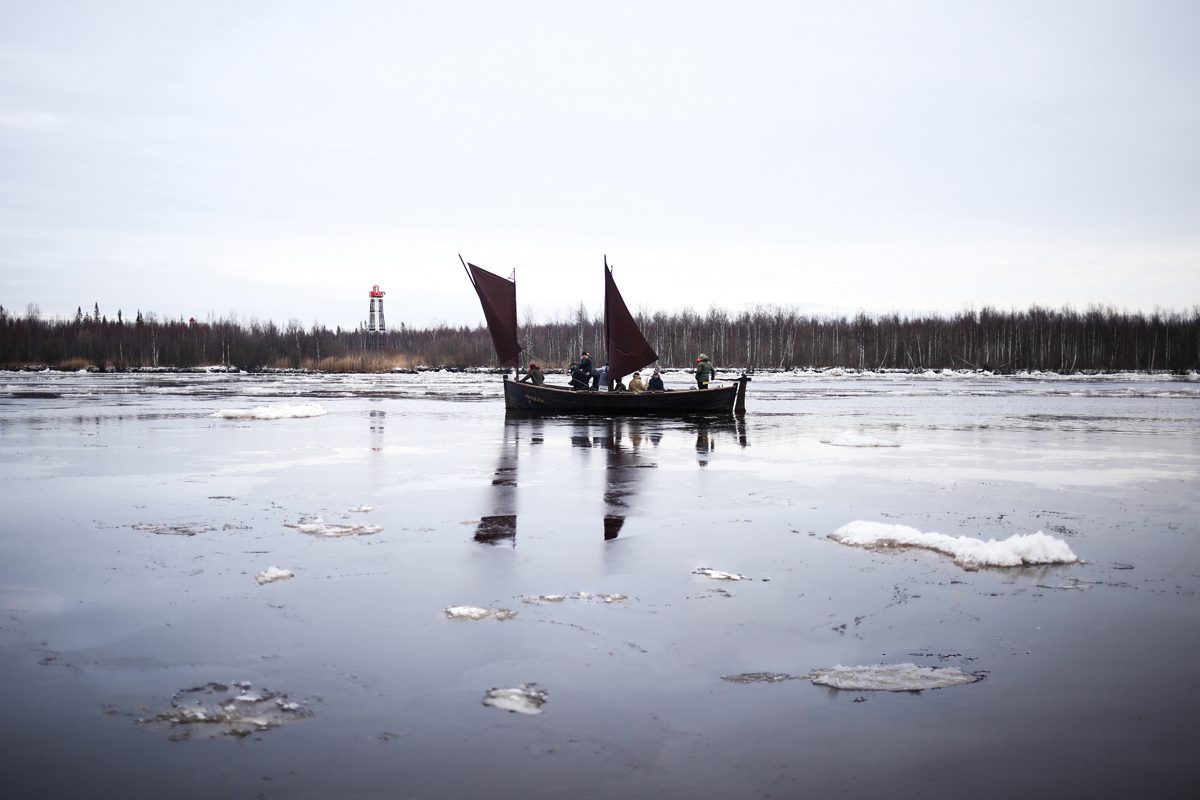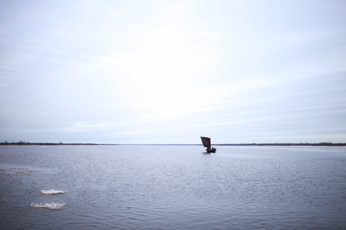 «Матера» хорошо вписалась в осенний пейзаж: тёмная просмолённая лодка, тёмная зеркальная вода, монохромные льдины, белый снег, черная земля и немного охры, оставшейся по деревьям на берегу. Синий дымок от костра напоследок окуривал простор реки, как ладан окуривает пространство храма.