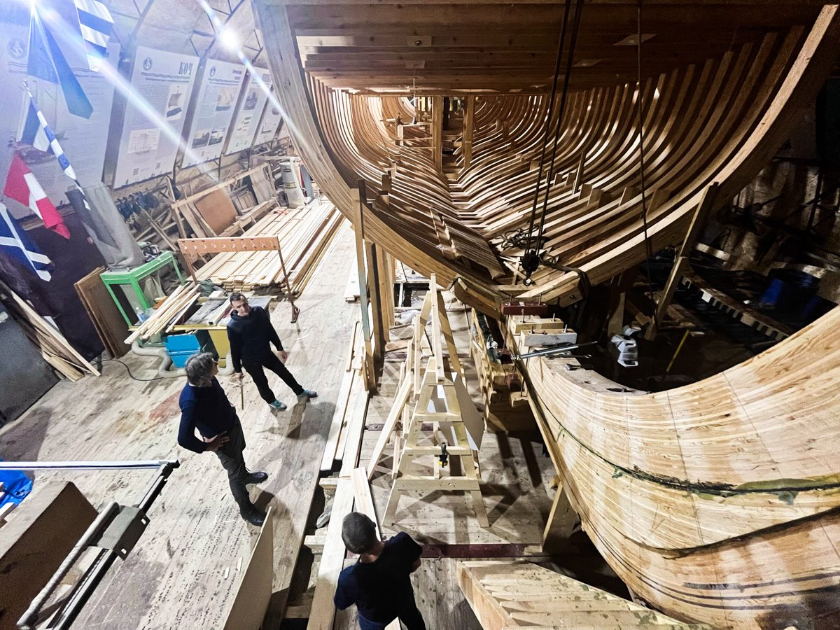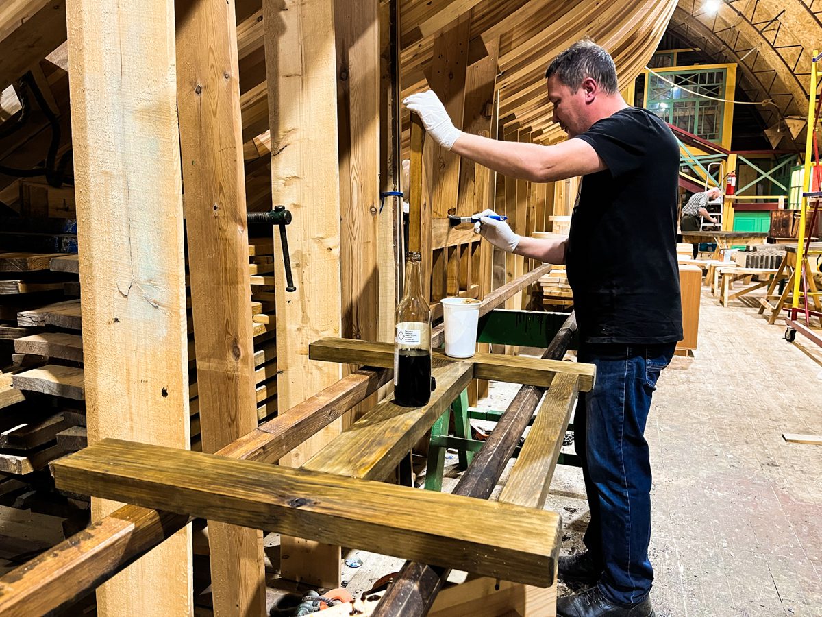 Приходили туристы. Расчет был на то, что они заклеят с нами тимберс шпангоута, но что-то пошло не так. Туристы довольно быстро устали и оставили Артёма и Мишу наедине с недоклеенным тимберсом. Артём с Мишей не испугались и всё доклеили. Миша ушёл и Тёма остался на верфи один, даже Саши-механика сегодня нет, потому что у него давление. А давление оттого, что погода – дрянь.