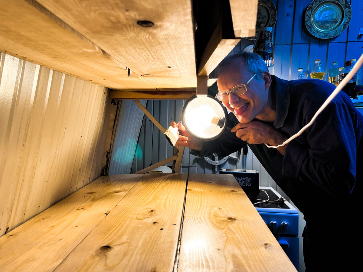 Тем не менее, выходные на верфи проходят в атмосфере созидательного труда: Леша делает изголовье для кровати в нашем общежитии на Чумбаровке, Ваня покрывает лаком столешницу на кухне, Катя начала было снимать краску с морского сундука, отошла на минутку, вернулась, а за дело уже взялся Максим – да так всё и доделал, вот какой благородный человек. Теперь сундук можно увозить в рамках программы по освобождению кладовки.