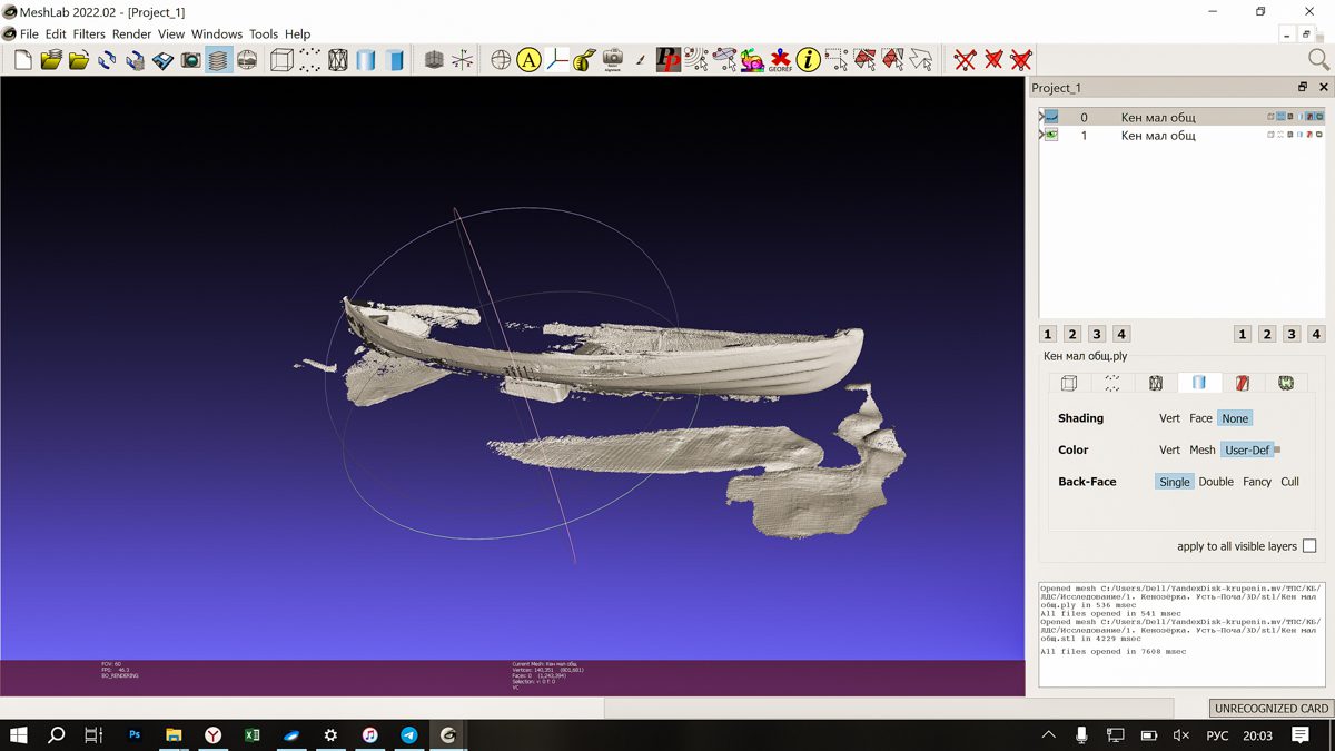 Были зафиксированы основные размерения лодки, а также с помощью технологии 3D-сканирования, при посредстве Iphone 13 Pro со встроенным лидаром, были получены файлы поверхностей и облаков точек для дальнейшего масштабирования, оптимизации и создания теоретического чертежа и полной 3D-модели лодки. Таким образом, будет обработана, консолидирована и архивирована информация об объекте, представляющем несомненную культурно-историческую ценность.