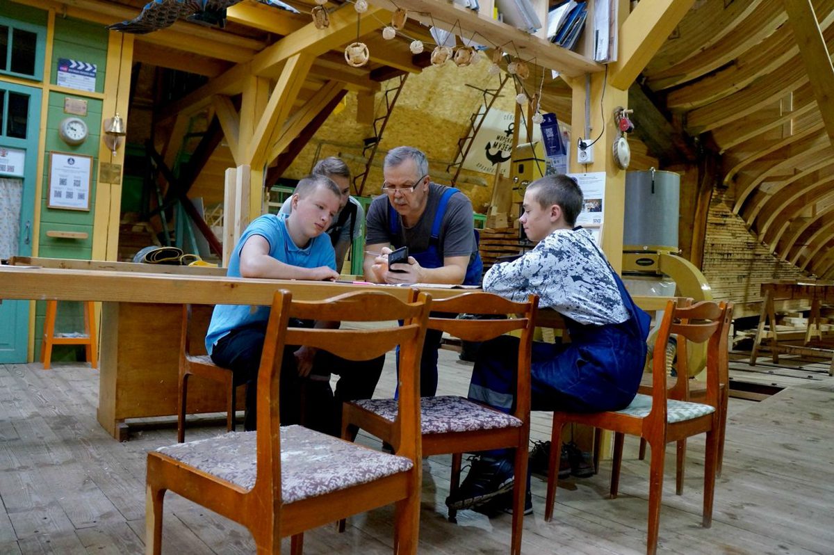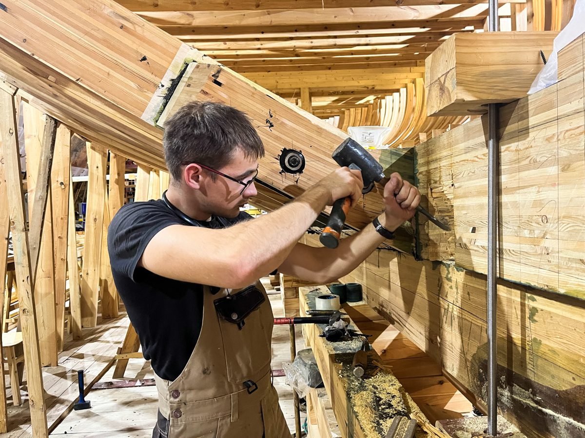На верфи стоит сверхъестественный мат: это Саша-механик учит наших практикантов плотницкому делу и жизни. С Сашей не забалуешь, насчёт работы и техники безопасности он просто дракон. А студенты ходят за ним, как цыплятки.