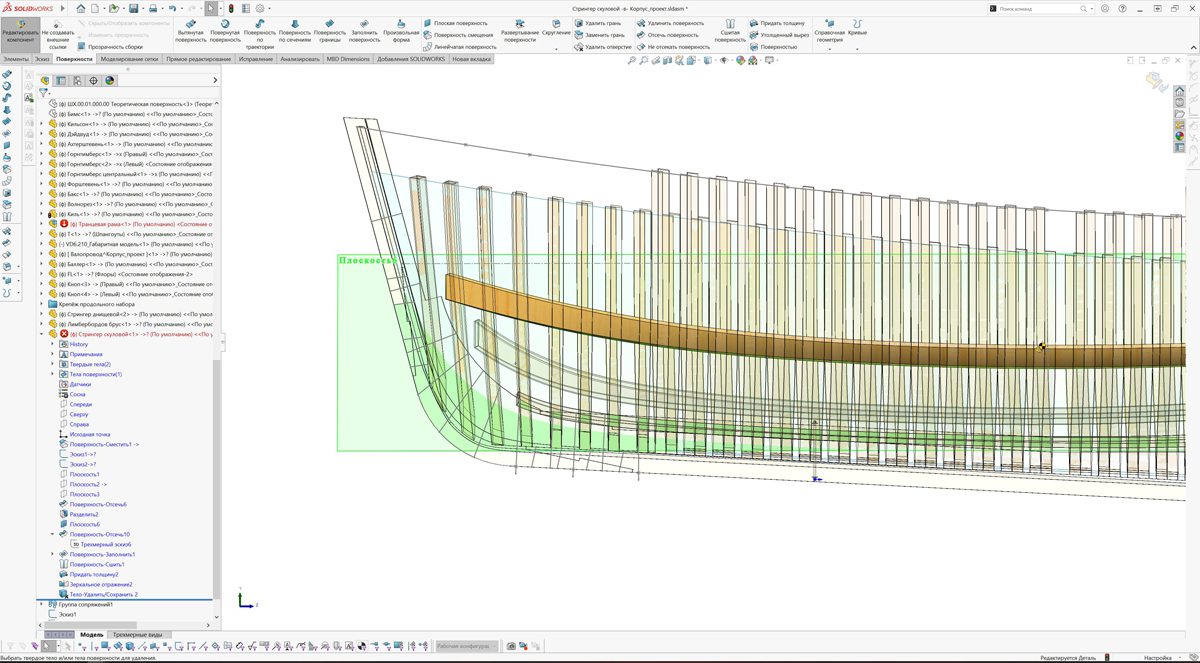 Вдобавок, сейчас мы проектируем стрингера. Имена у стрингеров следующие: лимбербордов брус, днищевой стрингер, скуловой стрингер и привальный брус. Все вместе они представляют собой продольные связи, которые возьмут, да и свяжут все шпангоуты в единую сетку.