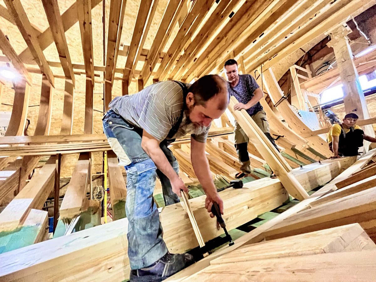 Пришёл на верфь молодой паренёк по имени Даниил, будет у нас работать. По древнему обычаю Даниил, как и всякий юный человек, ступивший под своды верфи, для начала приставлен к Александру-механику, дабы пройти через горнило истинной столярной науки. Будет зашивать потолок, а там посмотрим.