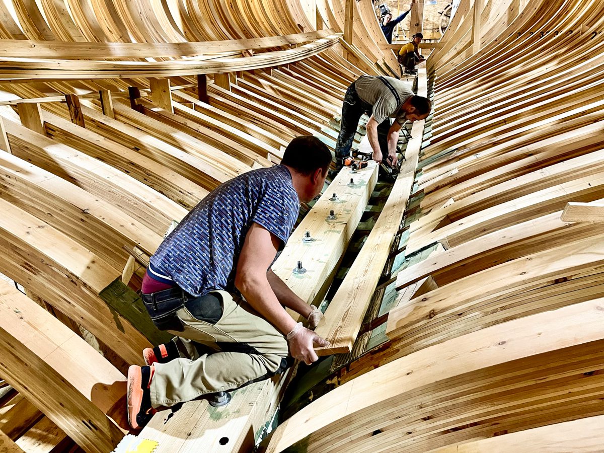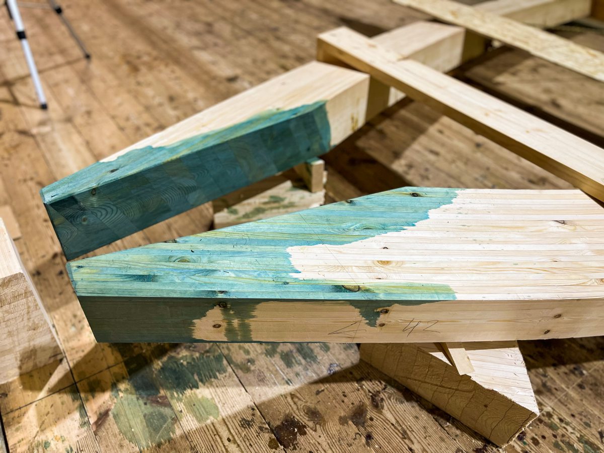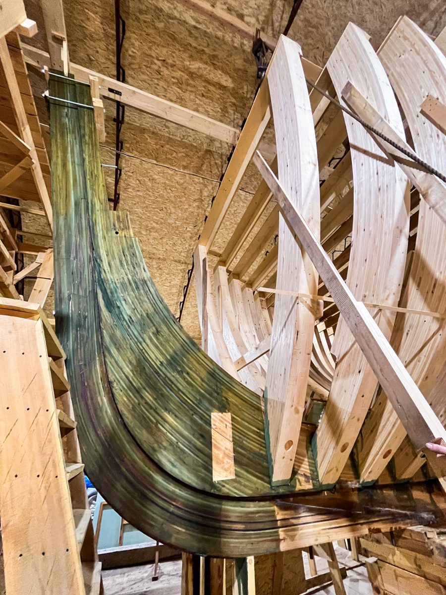 Три послойно склеенные и притянутые друг к другу струбцинами лиственничные лимбербордовы доски вместе представляют собой лимбербордов брус. Таких брусьев будет два – по одному с левого и правого бортов шхуны.