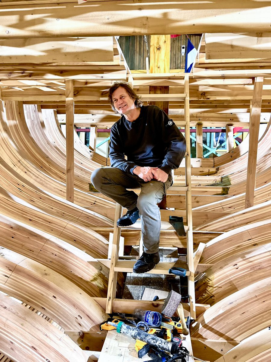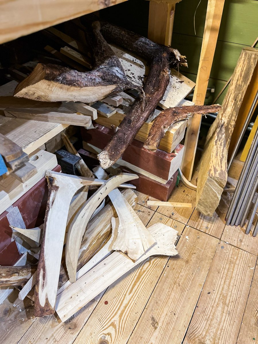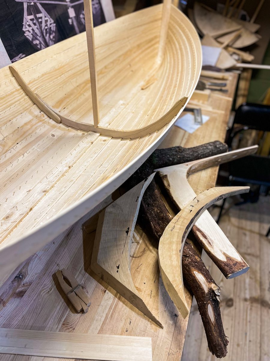 Игорь поставил первый шпангоут модели карбаса «Матера» для проекта «Мангазейский морской ход. Шпангоут сделан из обрезков брештука одного из наших карбасов, а брештук, в свою очередь, из кокоры.