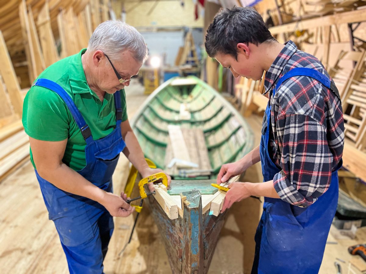 Александр с Даниилом починяют кимженский карбасок для Северного морского музея. Фотографироваться Даня не любит, но выхода у него теперь особенно нет.