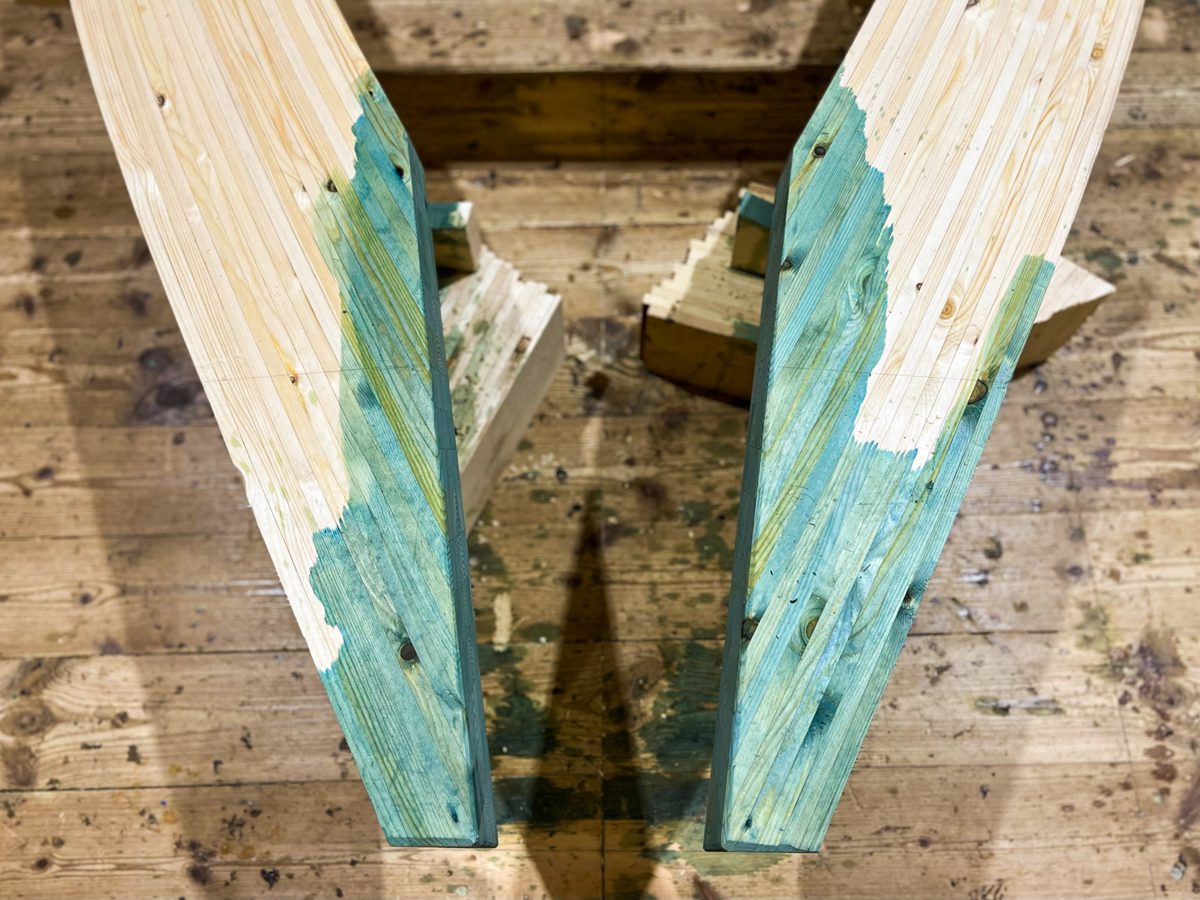 Нанесли пропитку на носовую часть шхуны. Теперь она похожа на коленку, которую намазали зелёнкой.