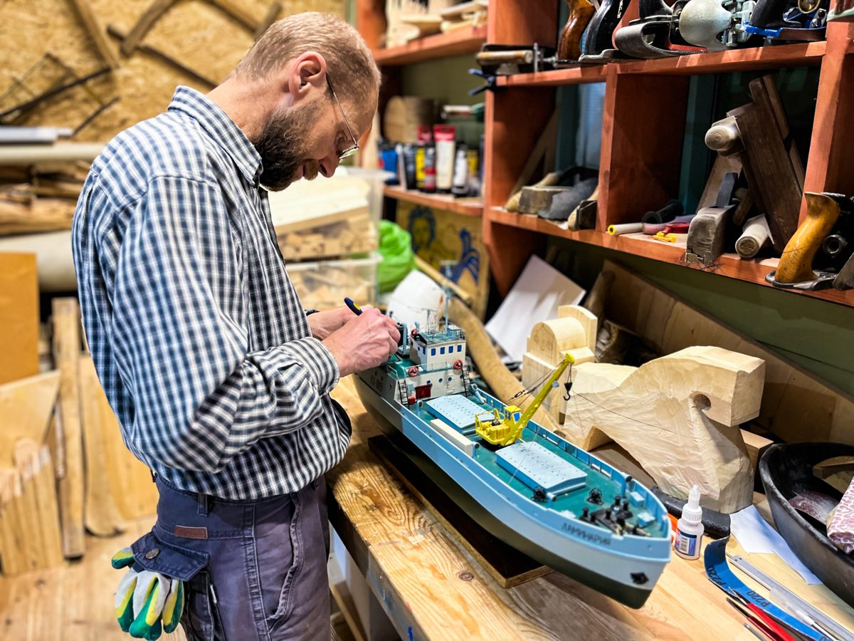 Андрей реставрирует модель теплохода «Ламинария» для Архангельского водорослевого комбината. Сухогруз «Ламинария» был частью флота комбината, в конце девяностых его списали, а позже утилизировали. Есть у этой лодки сестра по имени «Даурия» – она и сейчас ходит из Архангельска на Соловки вдоль Летнего берега Белого моря.