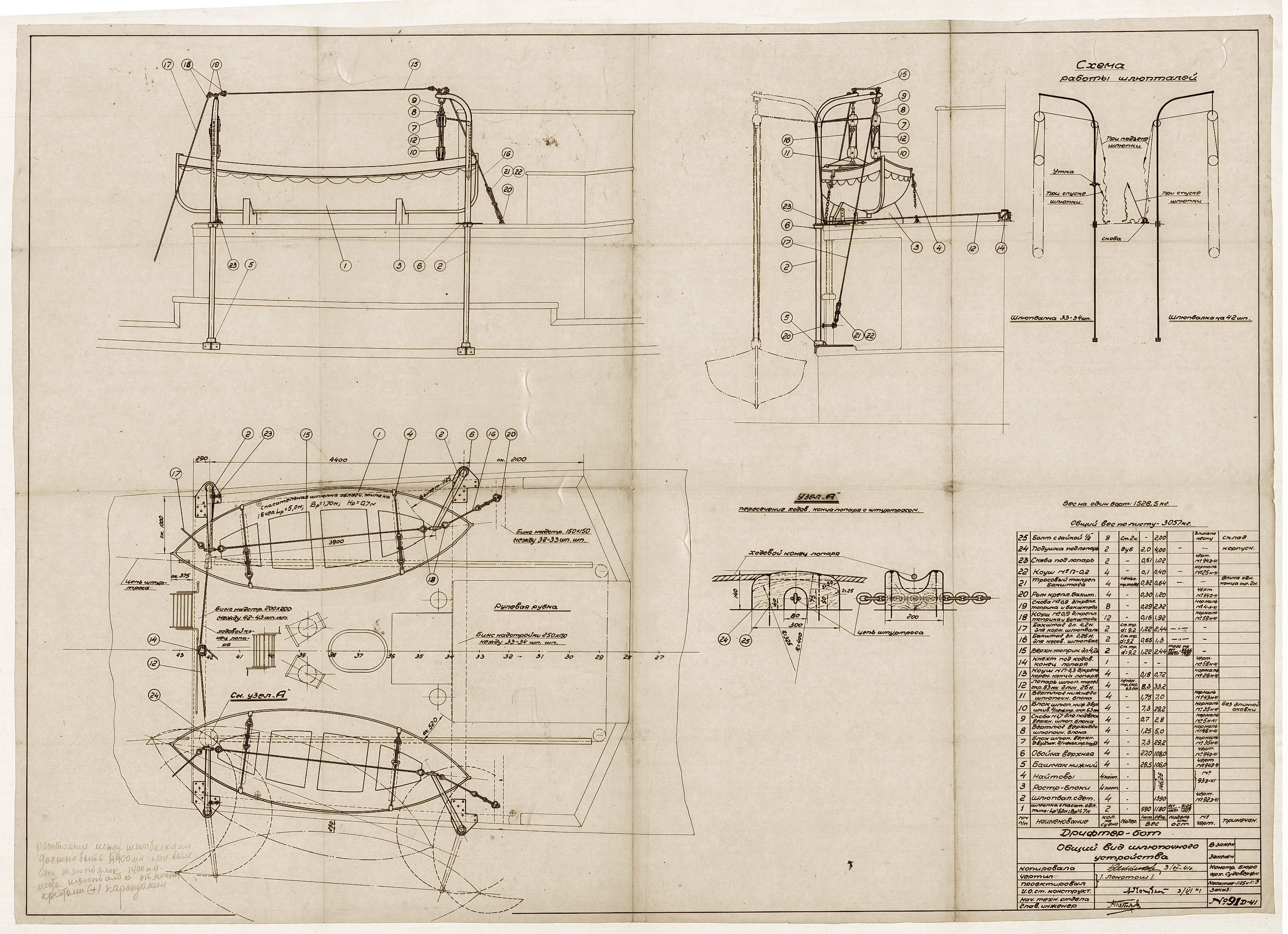 Итак, то, что мы видим перед собой – это изначальная версия чертежа дрифтер-бота в карандаше с самыми разнообразными подписями и пометками. На чертеже не указан год, но исходя из того, что в этой же папке находятся чертежи, датированные 1941 годом, мы можем сделать предположение, что он выполнен в то же время.