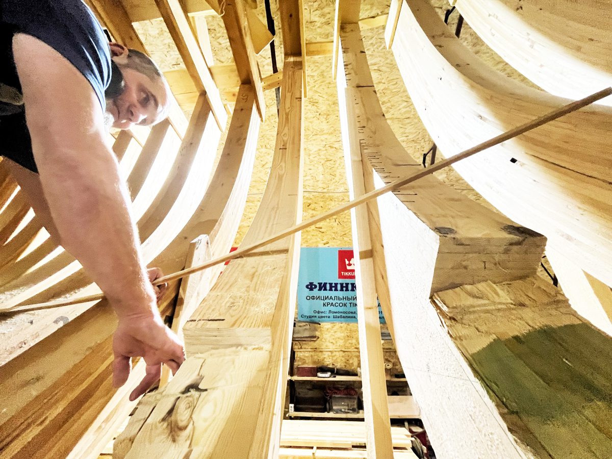 Для получения этой единой поверхности мы берём рейку и прикладываем её на пять-шесть шпангоутов. Рейка при этом ложится на один край шпангоута, а под вторым его краем получается зазор. Этот зазор измеряется и переносится на край с рейкой. По полученной линии мы снимаем весь лишний объём шпангоута, используя при этом цепную аккумуляторную пилу, тесло, рубанок-горбач, стамески, молотки и собственные мастерство с упорством.