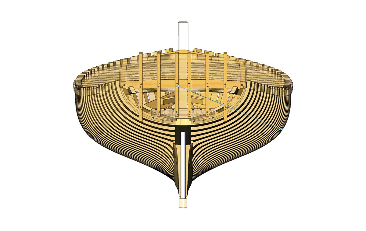 В результате всего этого у нас получается плавная погибь и единая поверхность, на которую мы в дальнейшем можем установить продольные связи-стрингера и настелить внутреннюю и внешнюю обшивку шхуны.