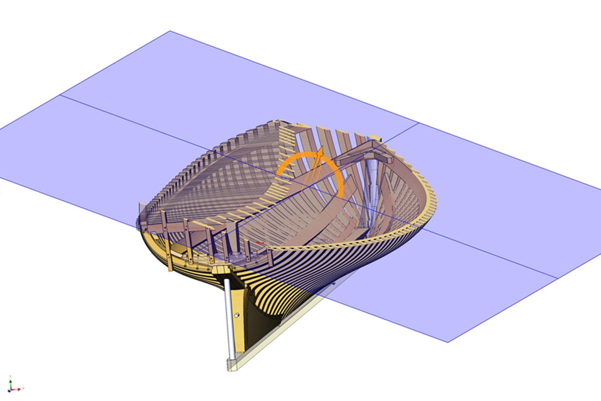 Далее. Корпус корабля имеет плавную погибь. Его шпангоуты стоят перпендикулярно килю. Когда шпангоуты устанавливаются на киль, они имеют прямоугольное сечение, и, если мы посмотрим на них сбоку, стоят как бы лесенкой – так, что край одного шпангоута выступает за край другого. От кормы к мидель-шпангоуту эта лестница поднимается, а от миделя к носу – спускается. Нам же нужна не лестница из ступенек, а, как мы помним, плавная погибь. Это два.