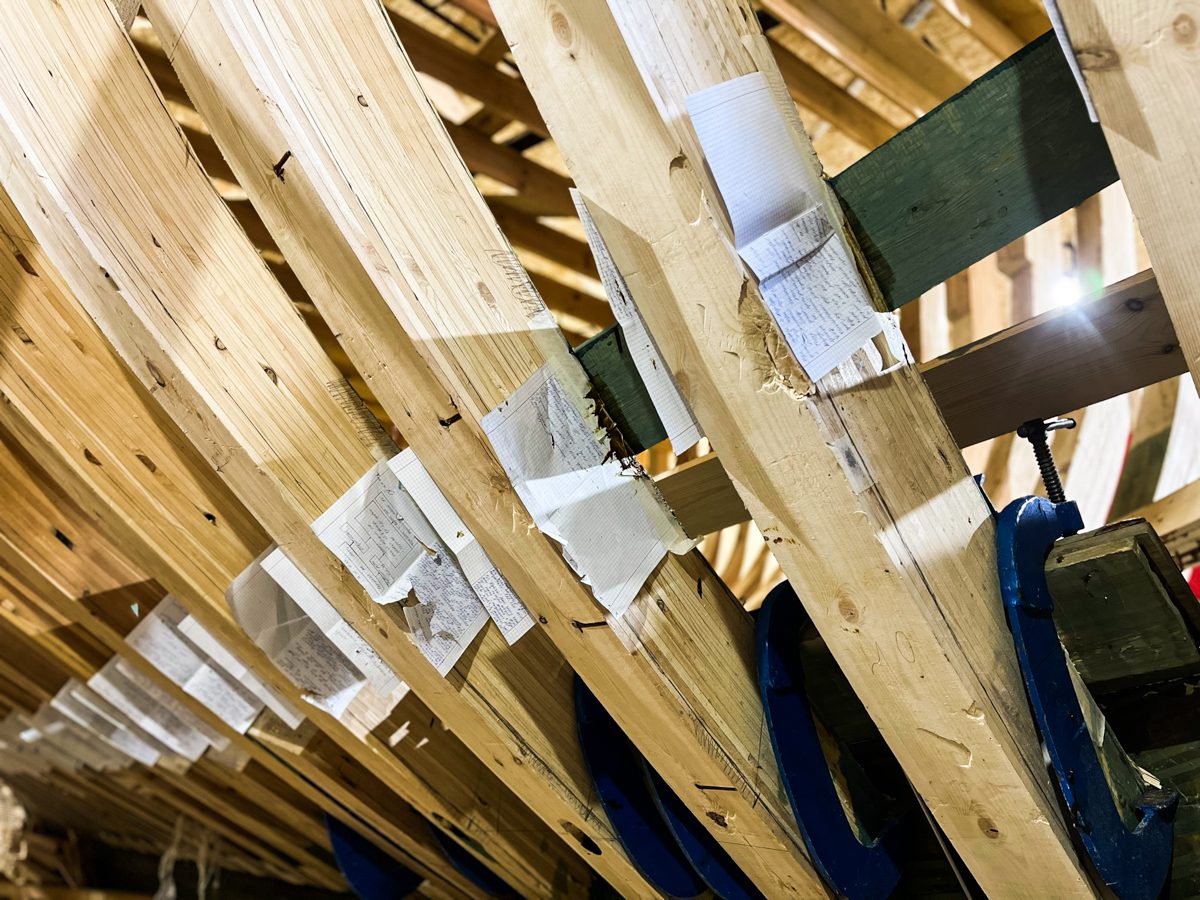 Походя вдоль шхуны можно заметить, что она оклеена каким-то письменами. Это научные труды нашего Нуркена, который в прошлом году окончил САФУ. Теперь его знания в бумажном эквиваленте берегут наши шпангоуты от загрязнений.