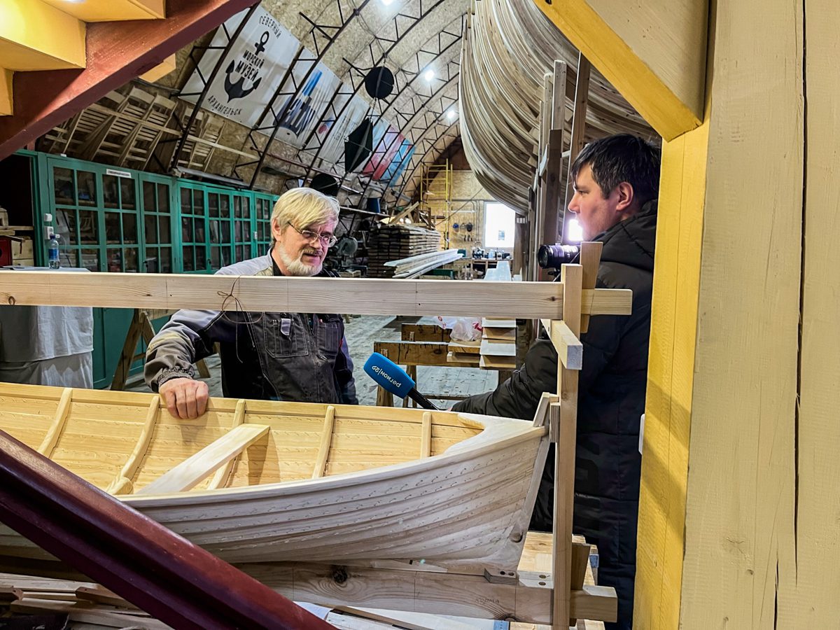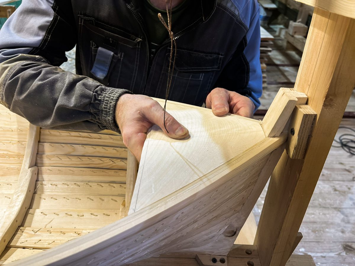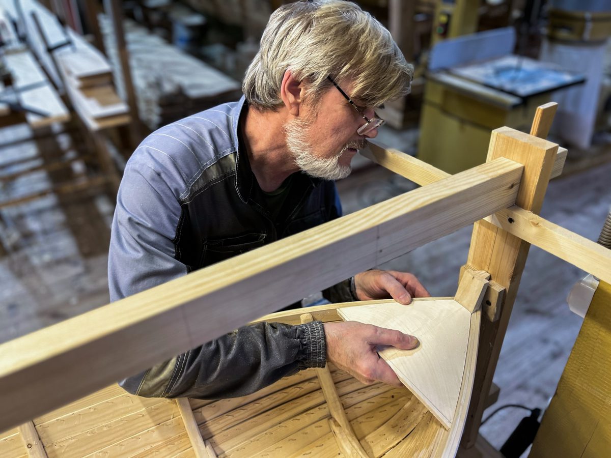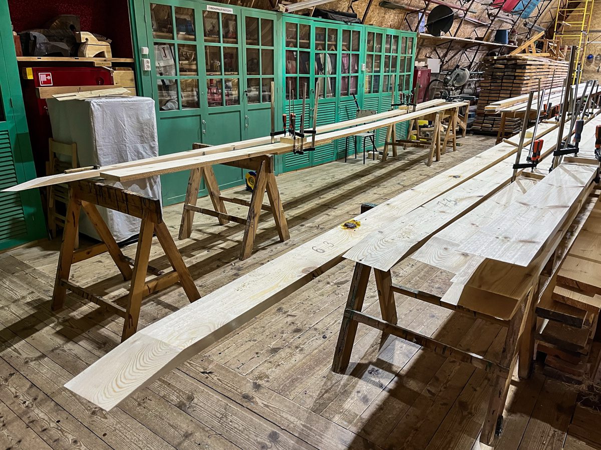 Иван продолжает усовать доски. И заодно испытывать уши коллег-судостроителей на устойчивость к воздействию истошного воя рубанка.