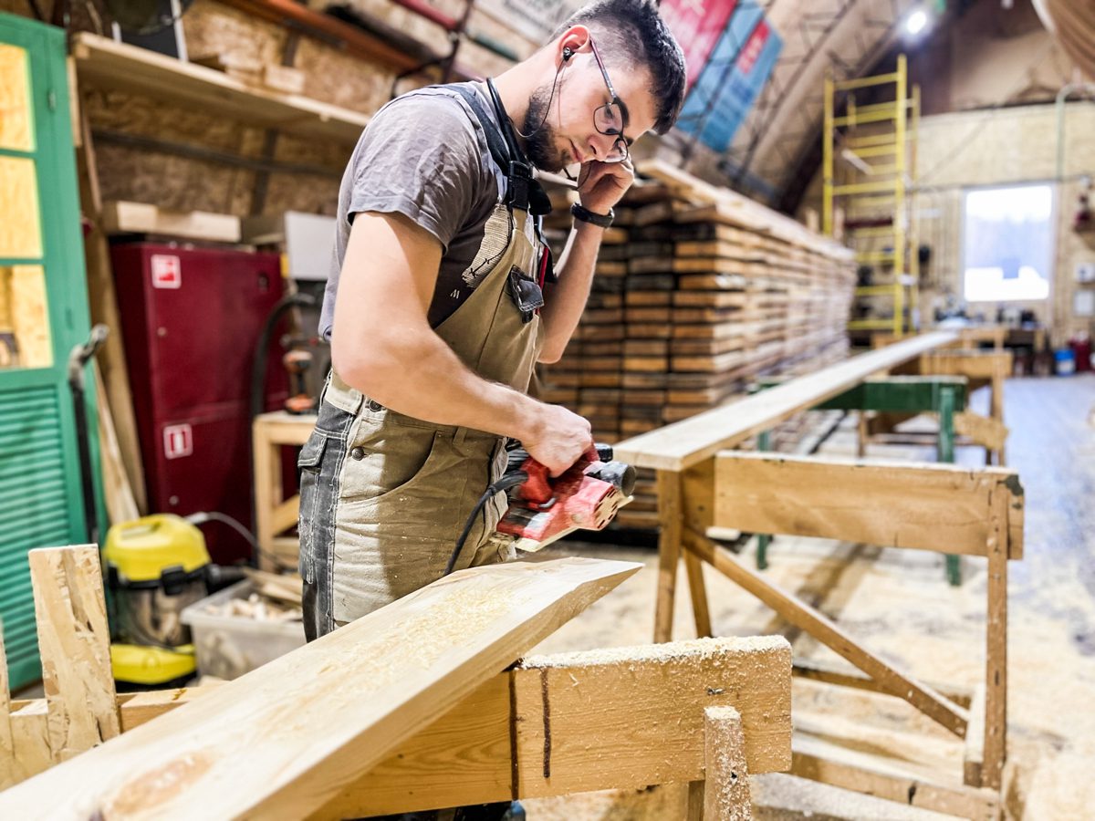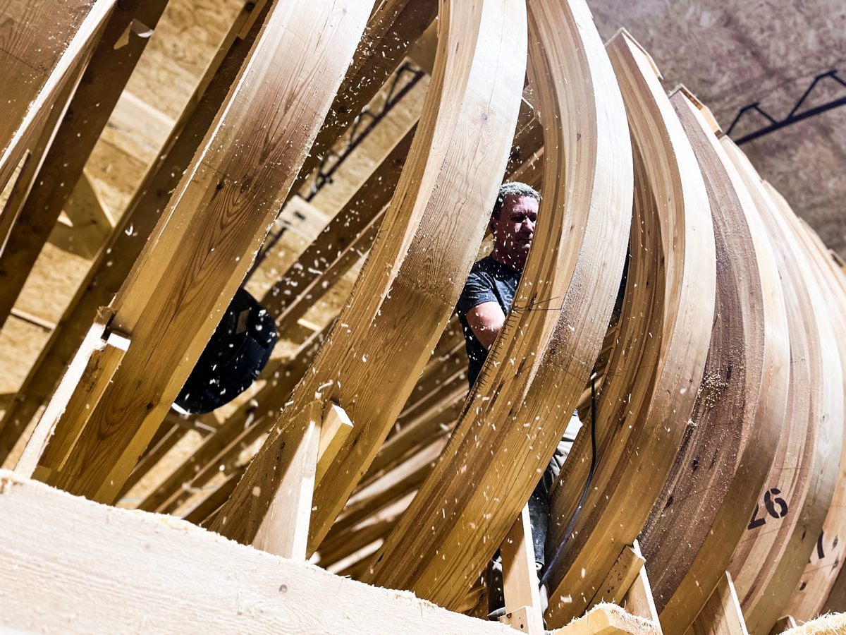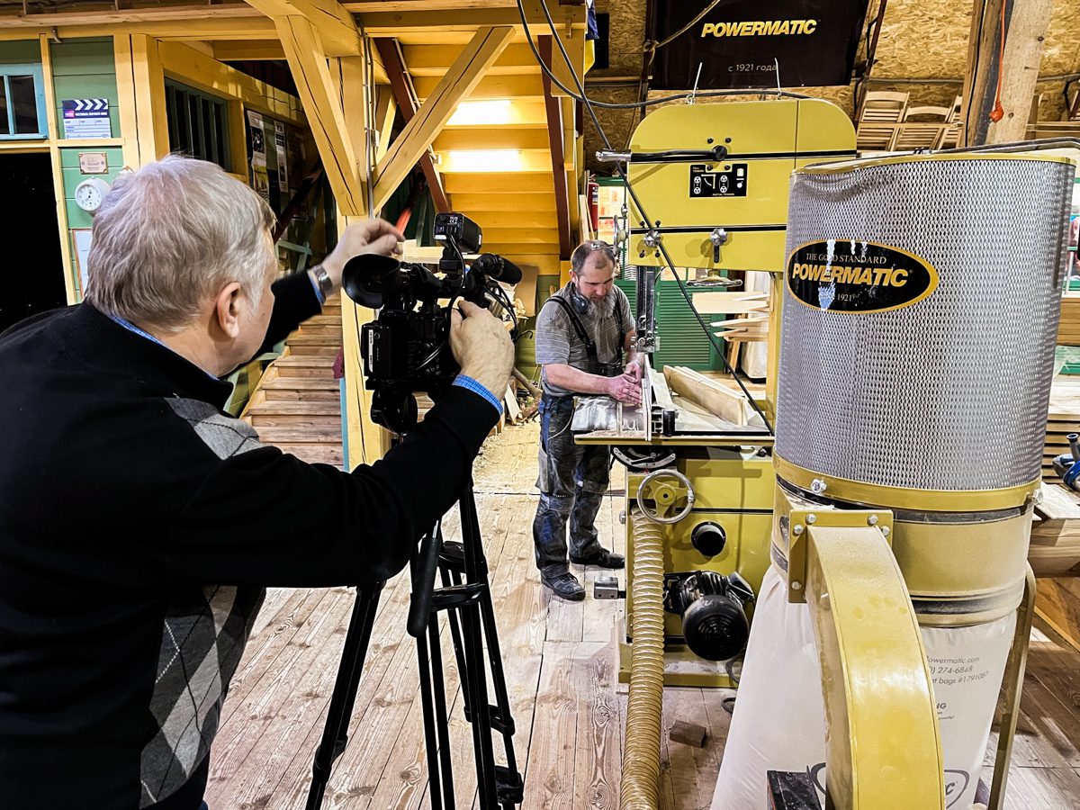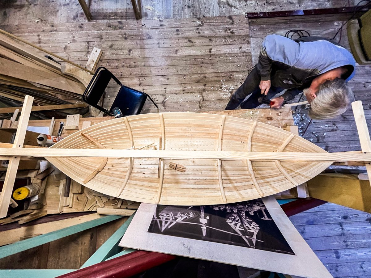 Иван продолжает усовать доски. И заодно испытывать уши коллег-судостроителей на устойчивость к воздействию истошного воя рубанка.