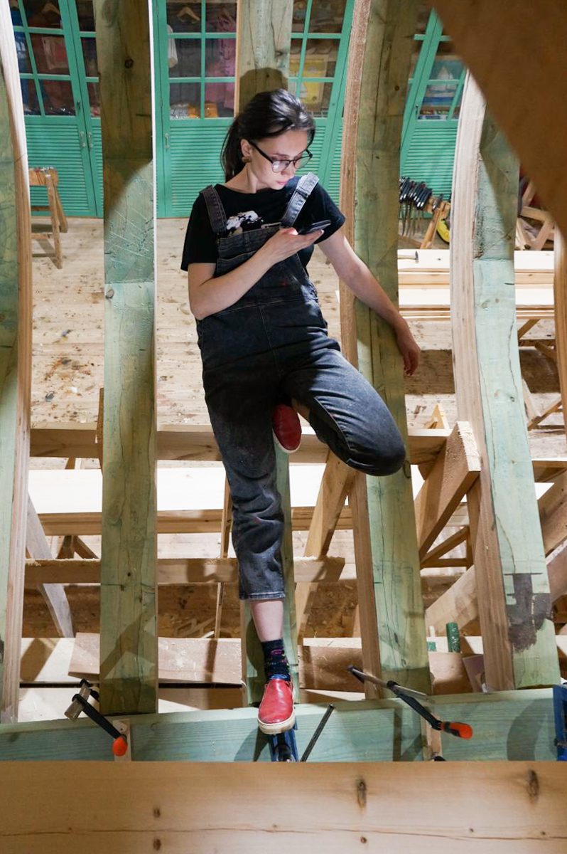 Катя расположилась на шпангоутах и загорает снимает, как красиво ребята работают.