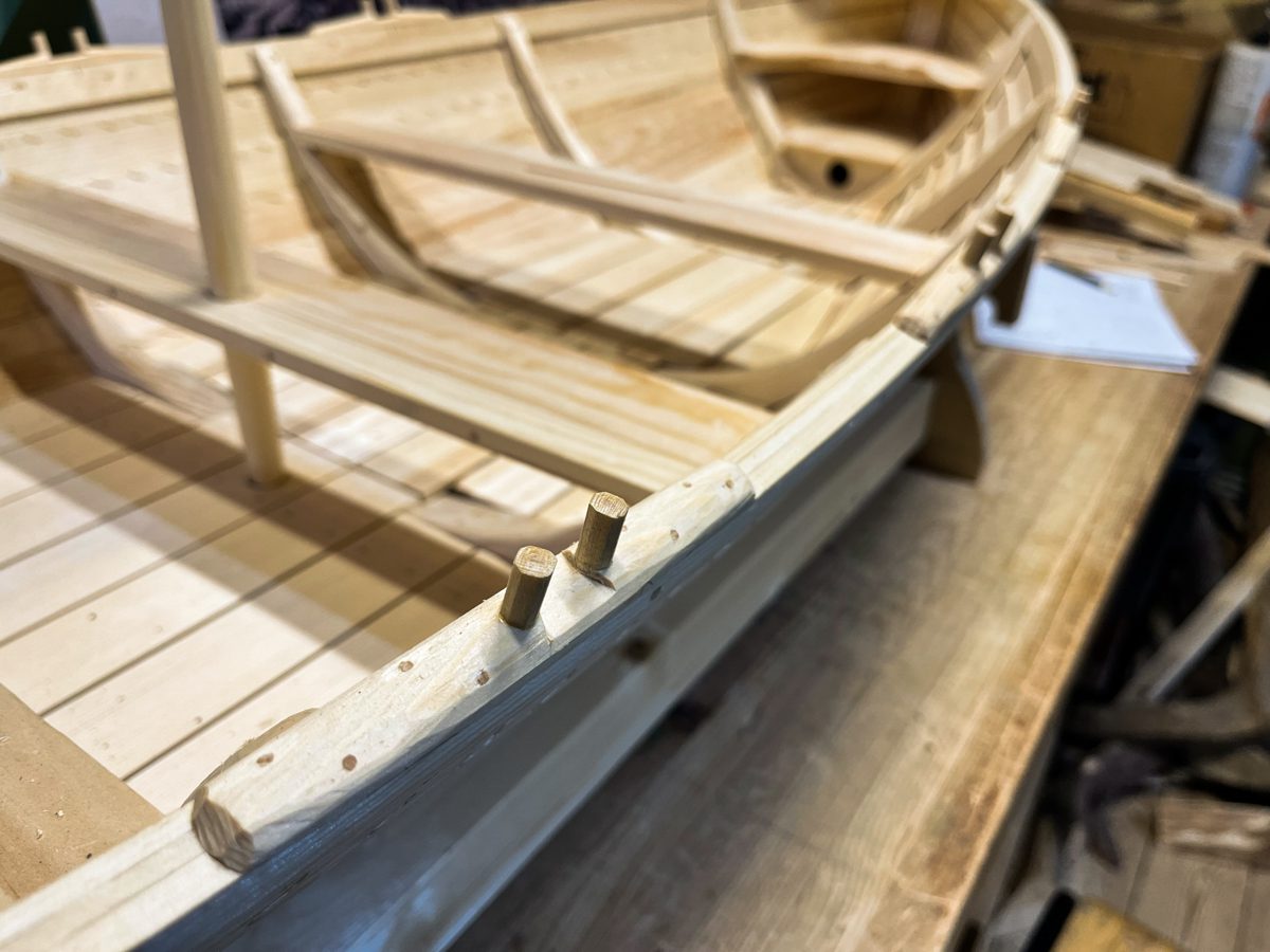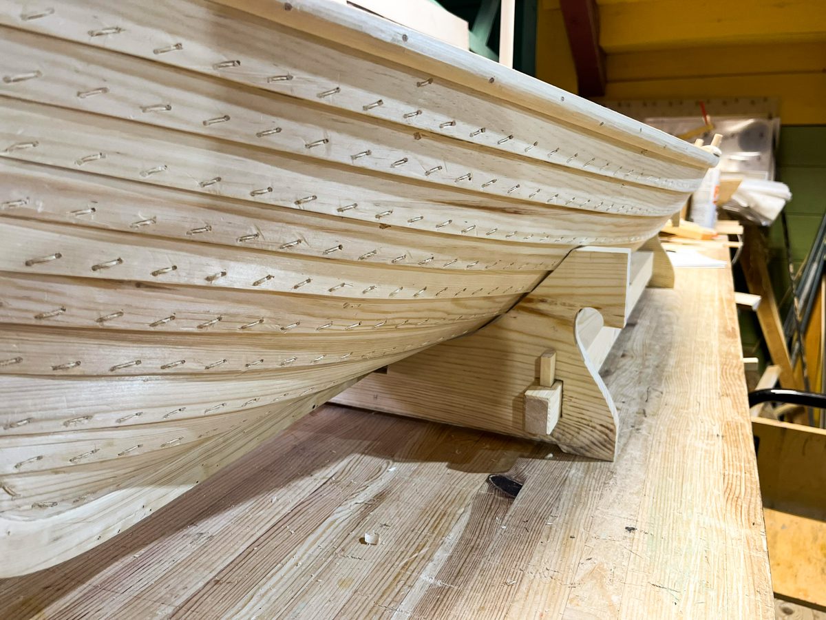 Модель «Матеры» продолжает процветать. Игорь установил мачты, вырезал фигурку коня на руле и поставил макет на кильблоки.