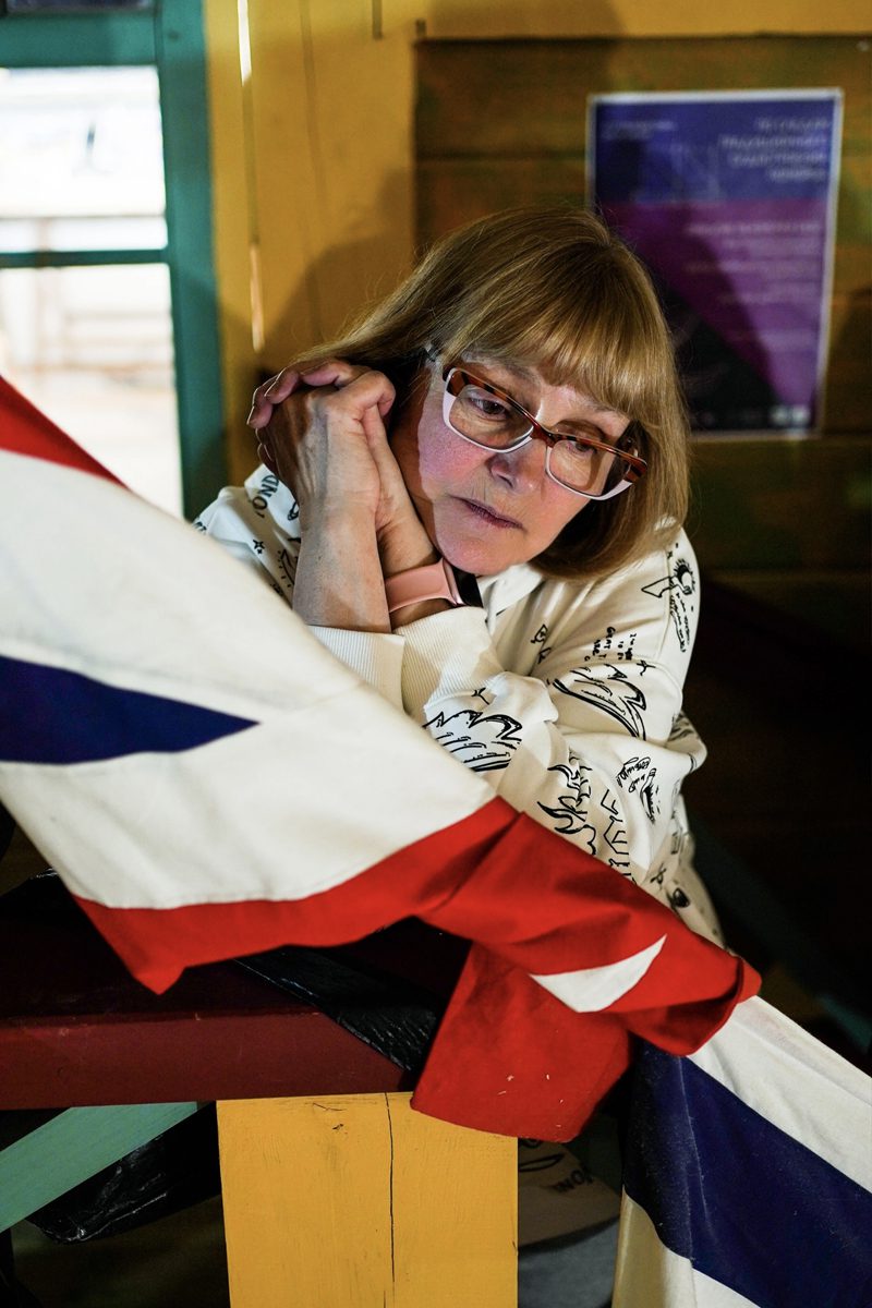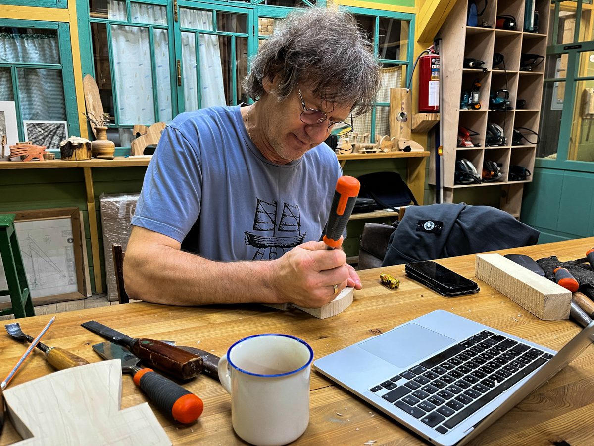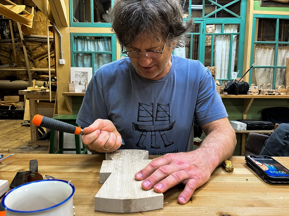 Женя надел очки (мы видим такое впервые) и вырезает кресты для «Матеры».