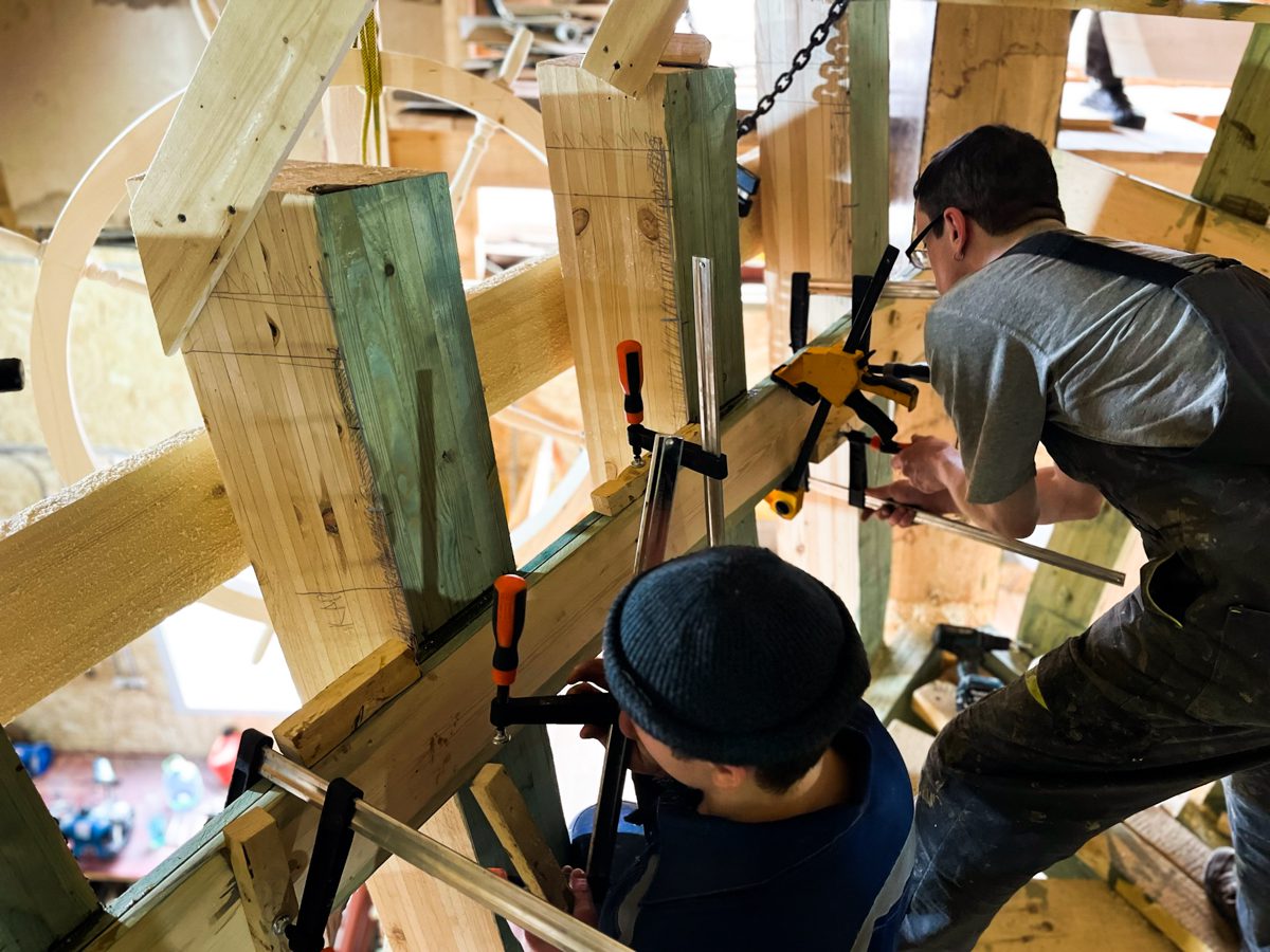 В связи с этим в цеху формируется новая бригада шхуностроителей. Александр-механик с Артёмом Калининым и Егором Дмитриевым ставят левый подклямс. Артём говорит: «Ну, что, струбцинируем, господа?»