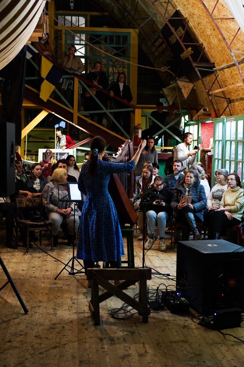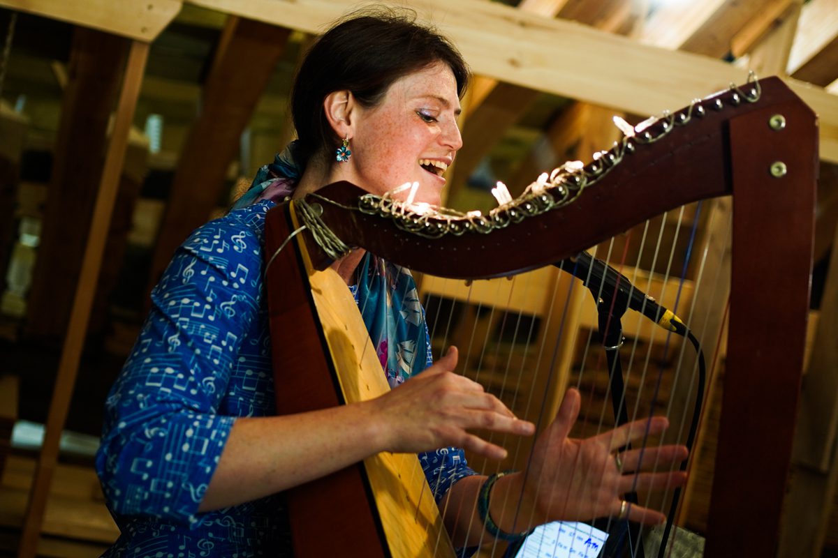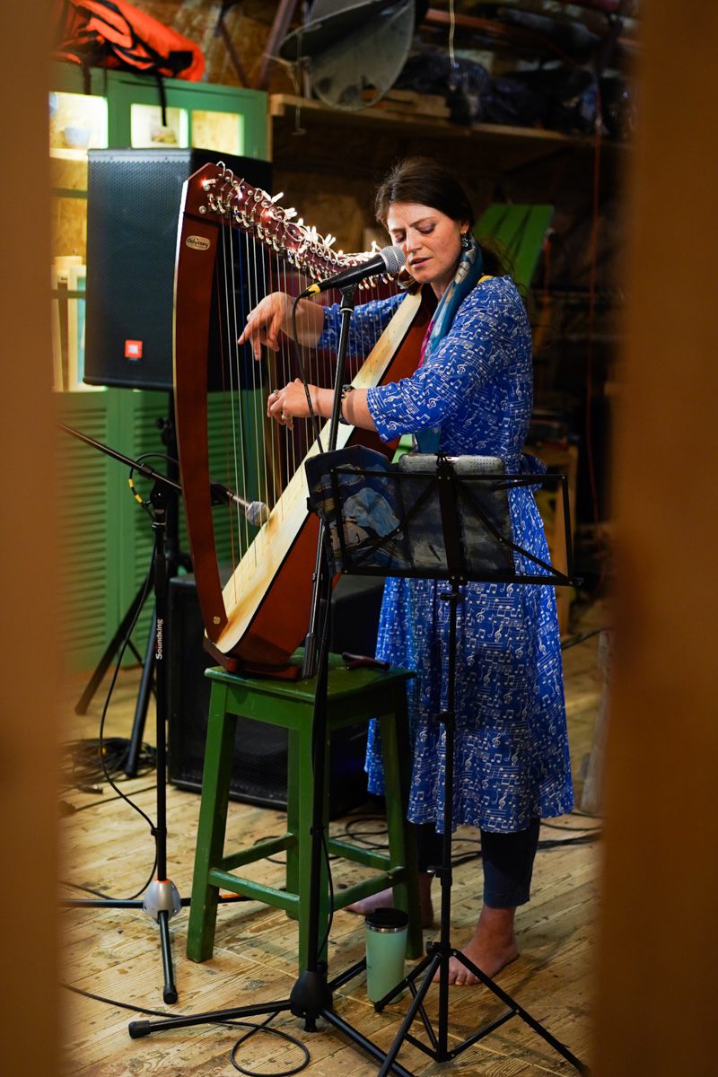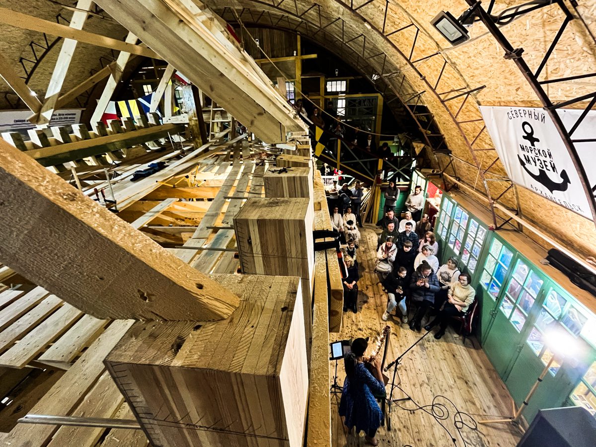Вечером арфистка Мария Хачатурова, которая вместе с Михаилом Вьюевым всю неделю работала у нас волонтёром и красила поморские карбасы, дала на верфи концерт «Арфа-акустика».