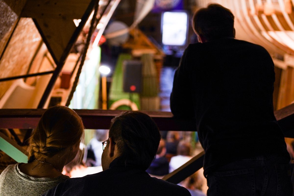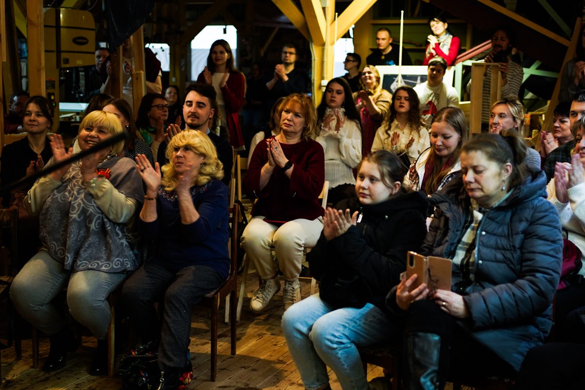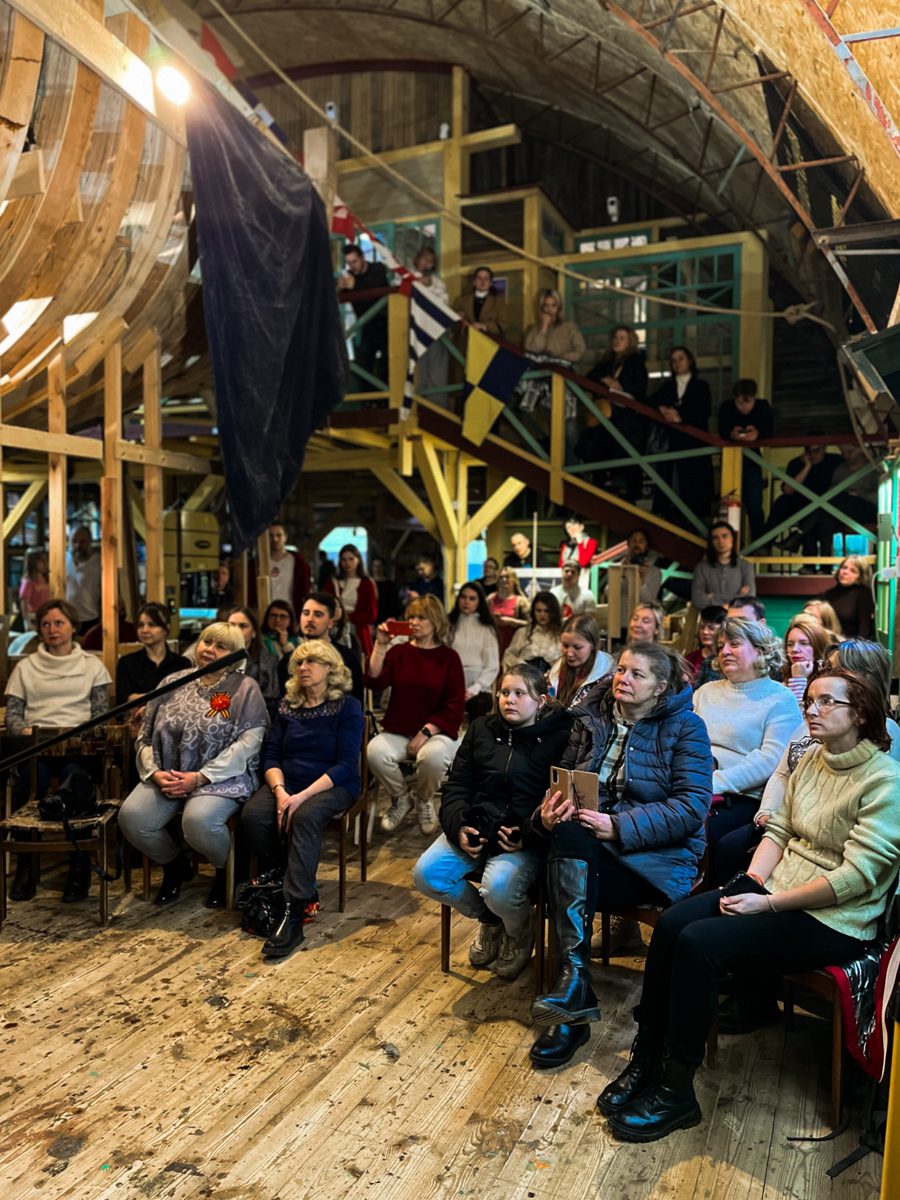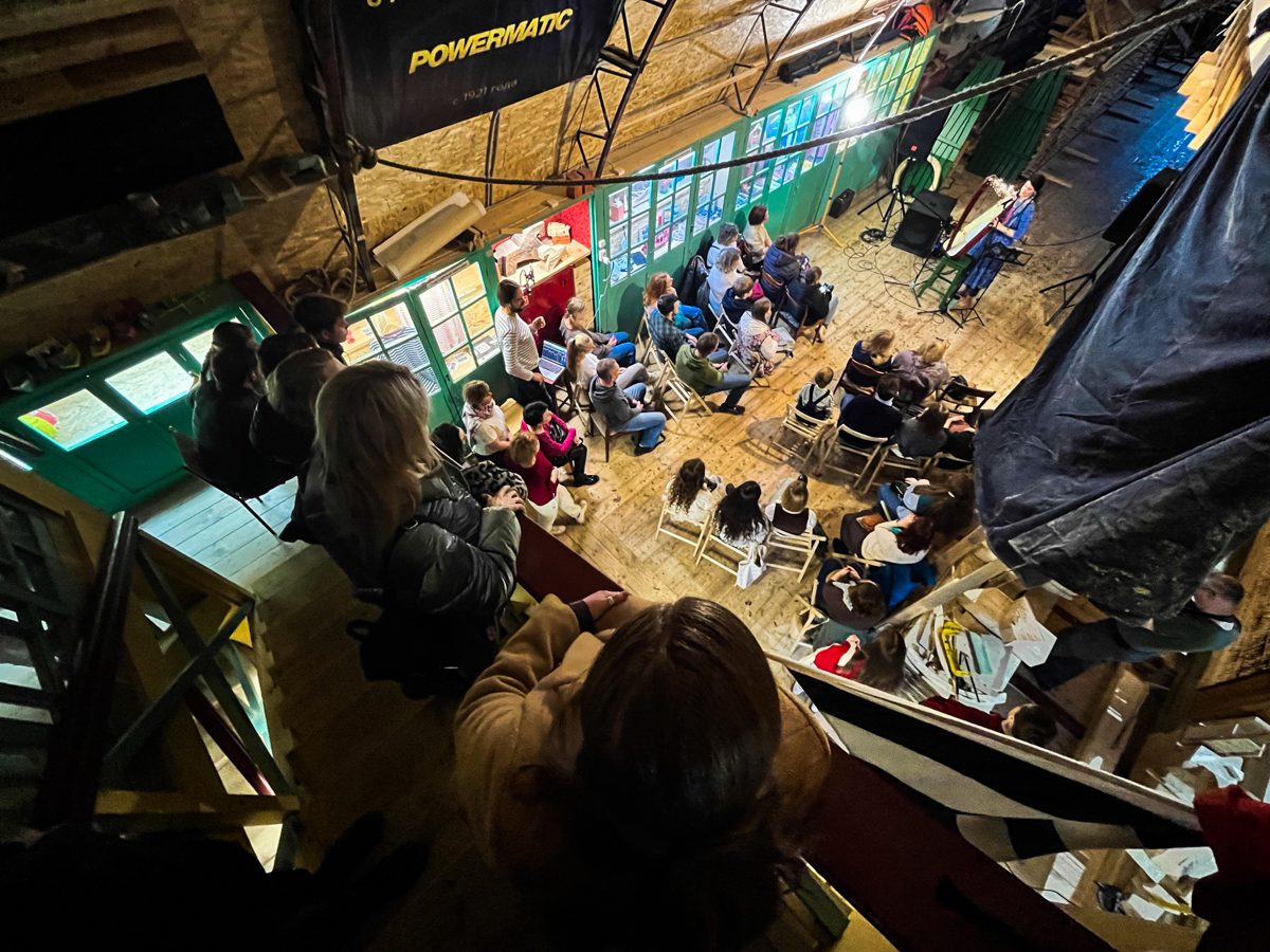 Вечером арфистка Мария Хачатурова, которая вместе с Михаилом Вьюевым всю неделю работала у нас волонтёром и красила поморские карбасы, дала на верфи концерт «Арфа-акустика».