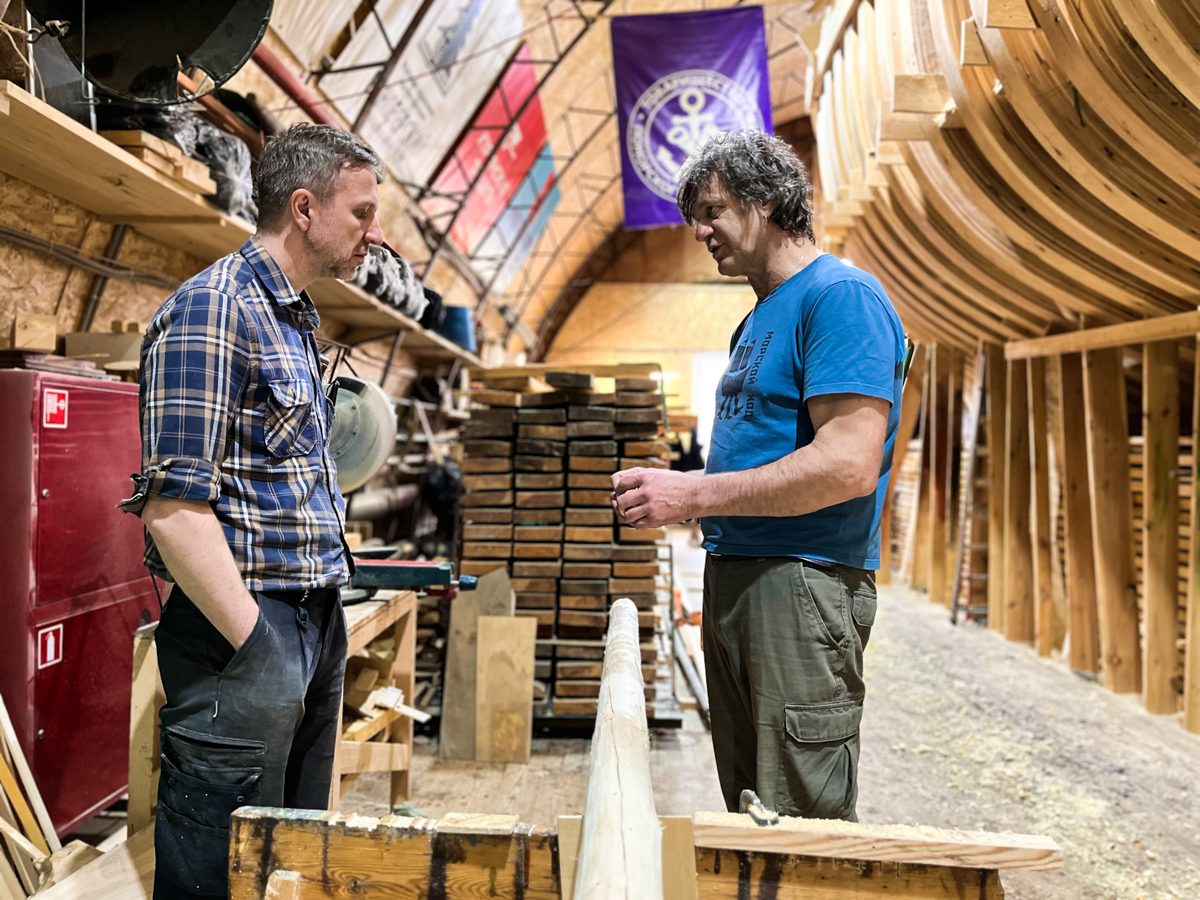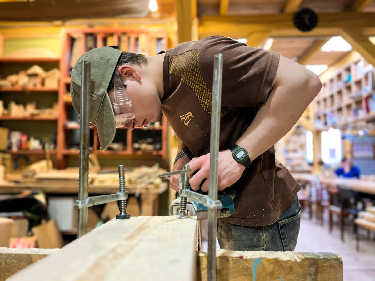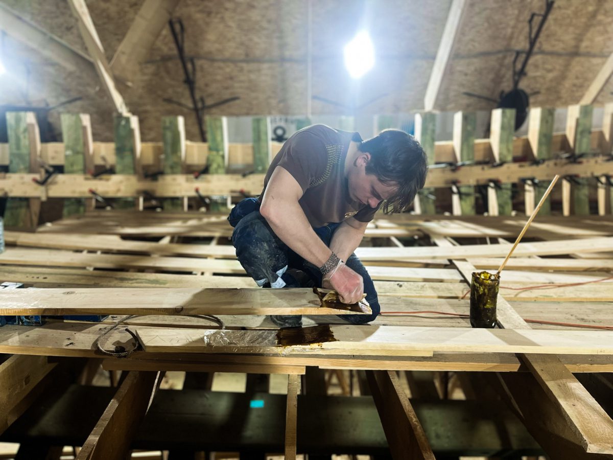 Артём Калинин с Егором строгают и клеят доски и ставят подклямсы «Поморской шхуны».