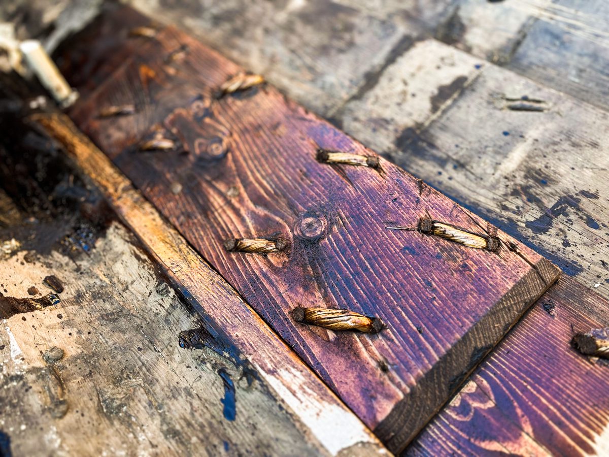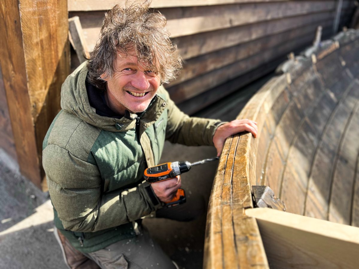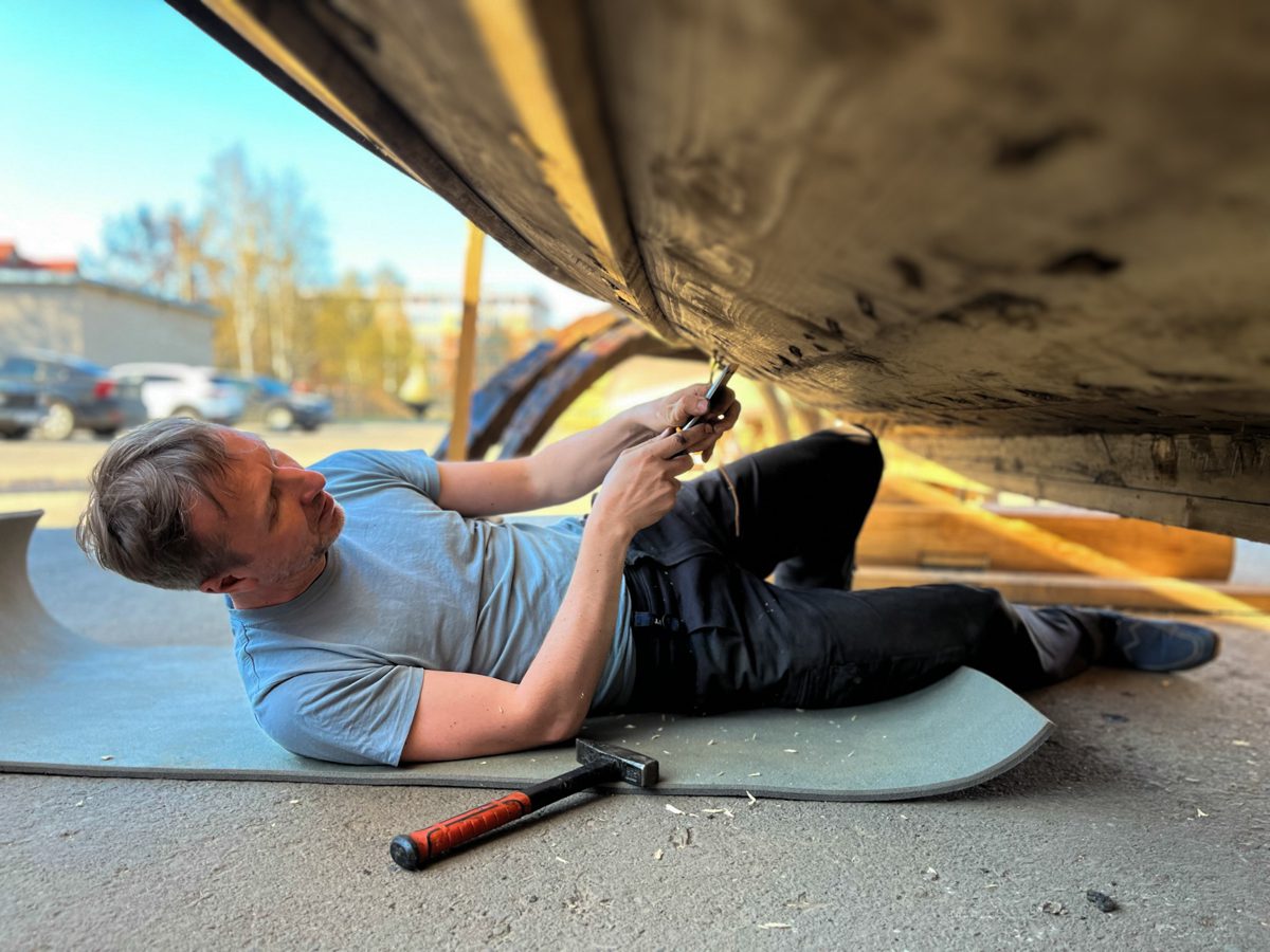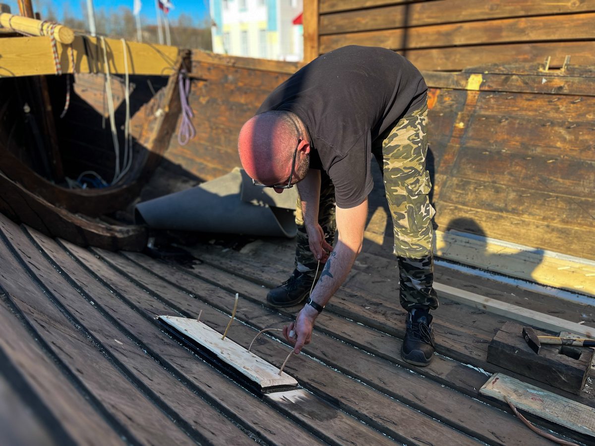 На выходных из Иваново приехал наш друг и волонтёр Коля Виноградов. Коля думал, что на верфи он будет медитативно красить вёсла. Вместо этого Колю приставили к непокорной вице и шитью заплат.