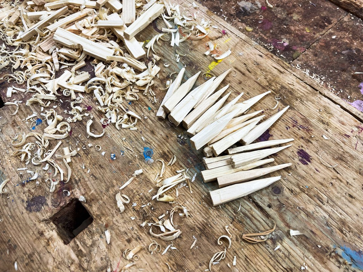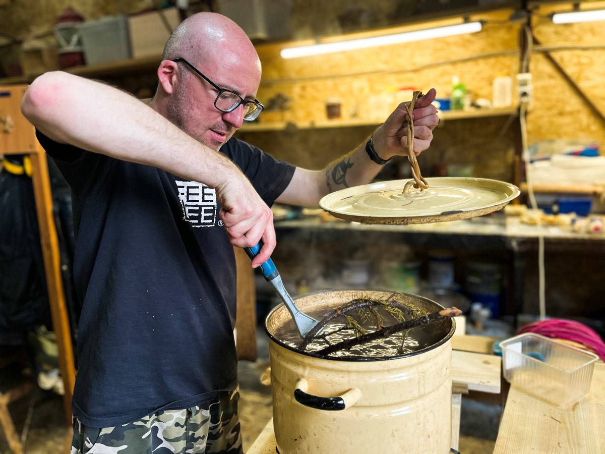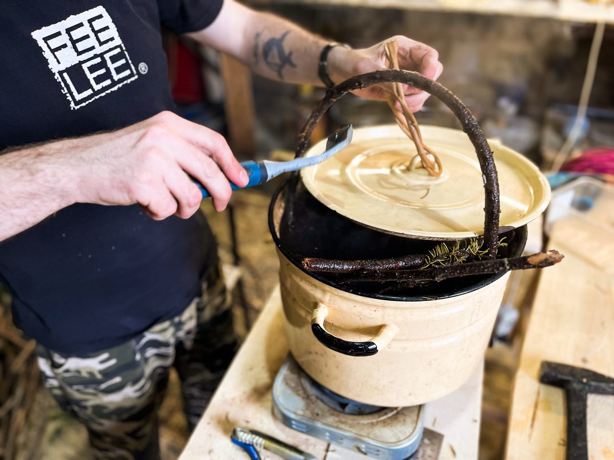Теперь Коля шьёт вместе с Максом. Полный цикл – от обработки и вываривания веток до нарезания клинышков и стежков по набоям.