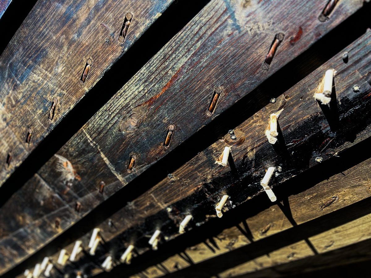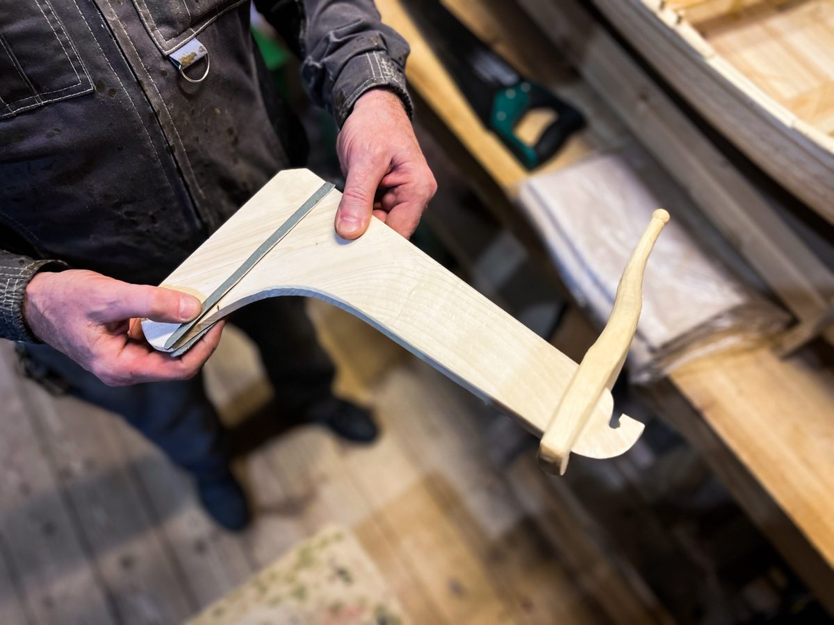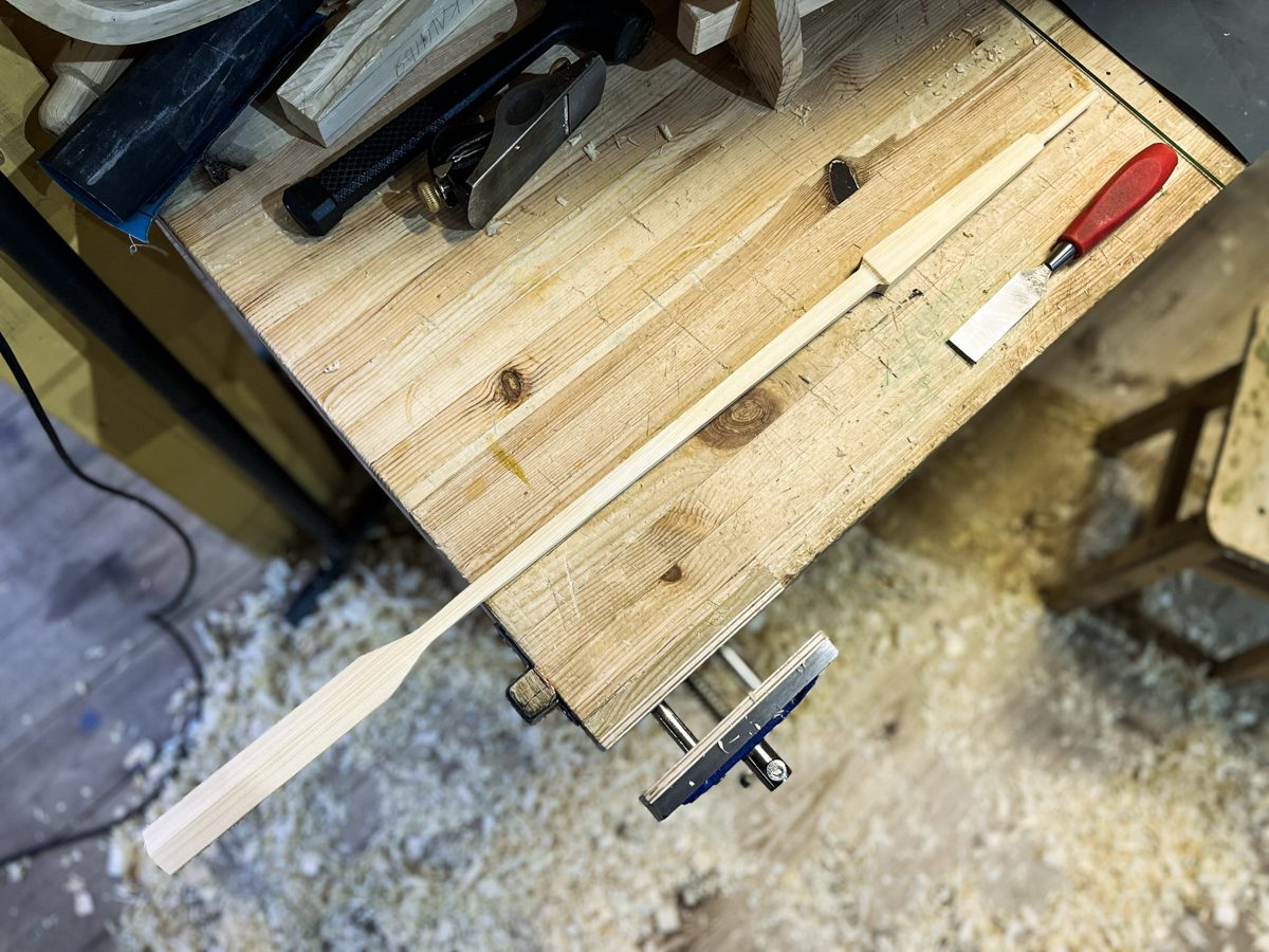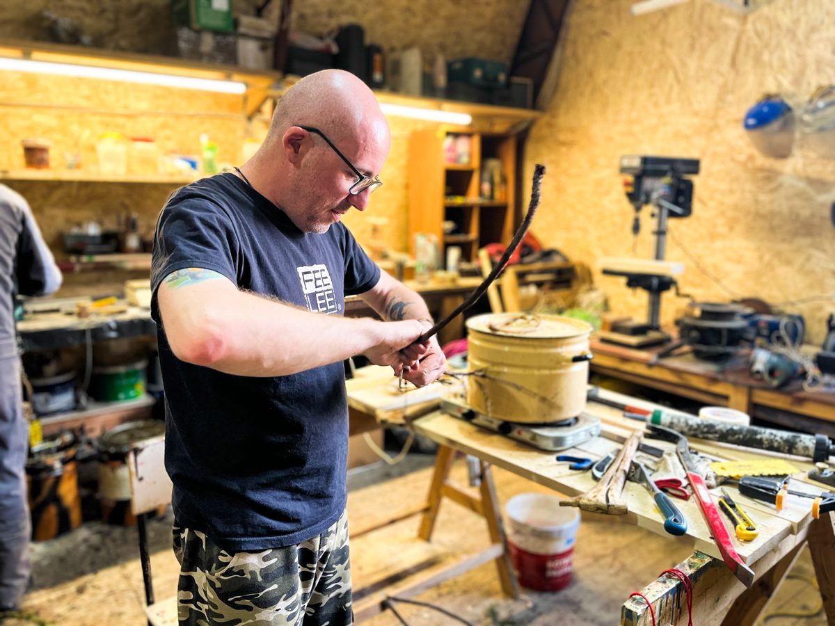 Теперь Коля шьёт вместе с Максом. Полный цикл – от обработки и вываривания веток до нарезания клинышков и стежков по набоям.