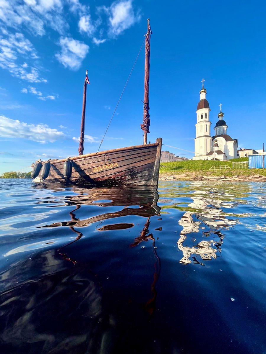 8 июня, 16:35. Архангельск. Экипажи карбаса «Матера» и катамарана «Товарищ» вышли в экспедицию проекта «Мангазейский морской ход» — под колокольный звон и дождь от причала возле яхт-клуба на Логинова.